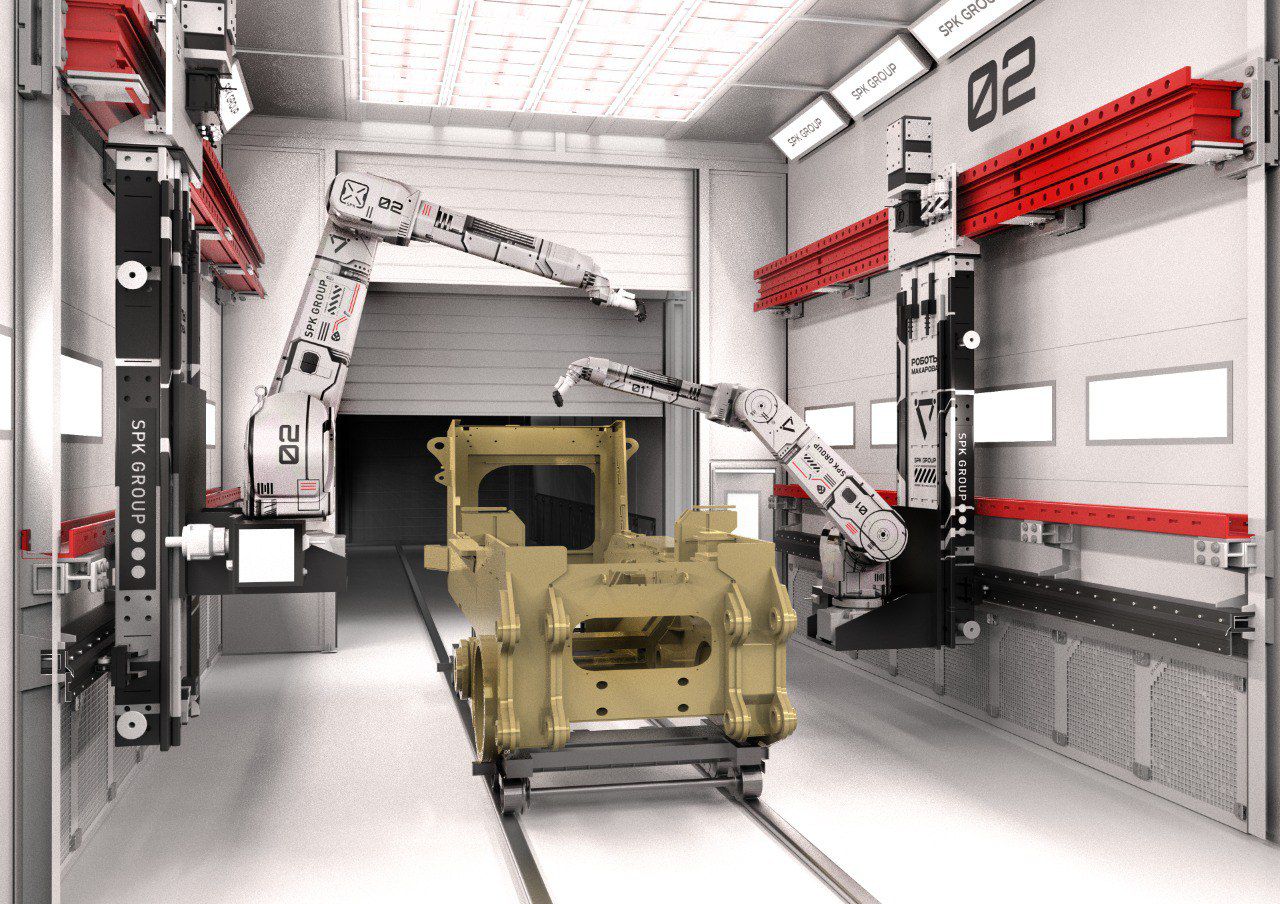Покрасочный комплекс, оснащенный роботами для покраски автомобилей, включает несколько рабочих зон. Перед тем как поступить в окрасочную камеру, изделия проходят специальную обработку с помощью автоматики и ручного оборудования. Так, например, роботизированный дробеструйно-окрасочно-сушильный комплекс SPK GROUP включает дробеструйную камеру SPK-SВB-18.7. система управления которой позволяет в реальном времени контролировать работу абразивоструйных агрегатов.