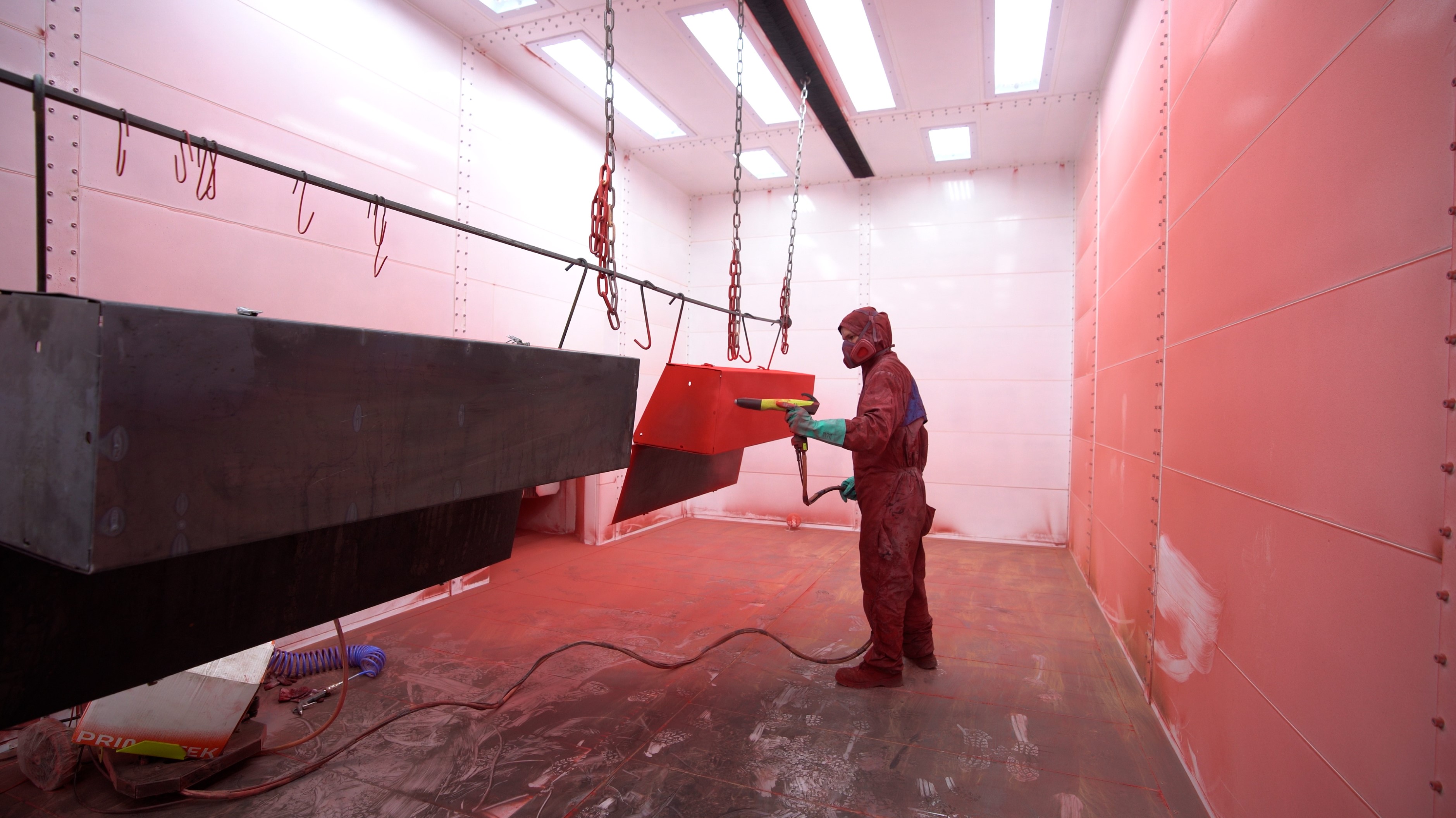 Ручной участок порошковой окраски с обитаемой камерой, включающий в себя полный цикл технологических операций: зачистка, мойка, сушка, нанесение покрытия, спекание.