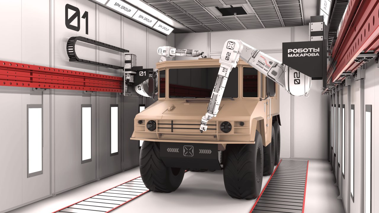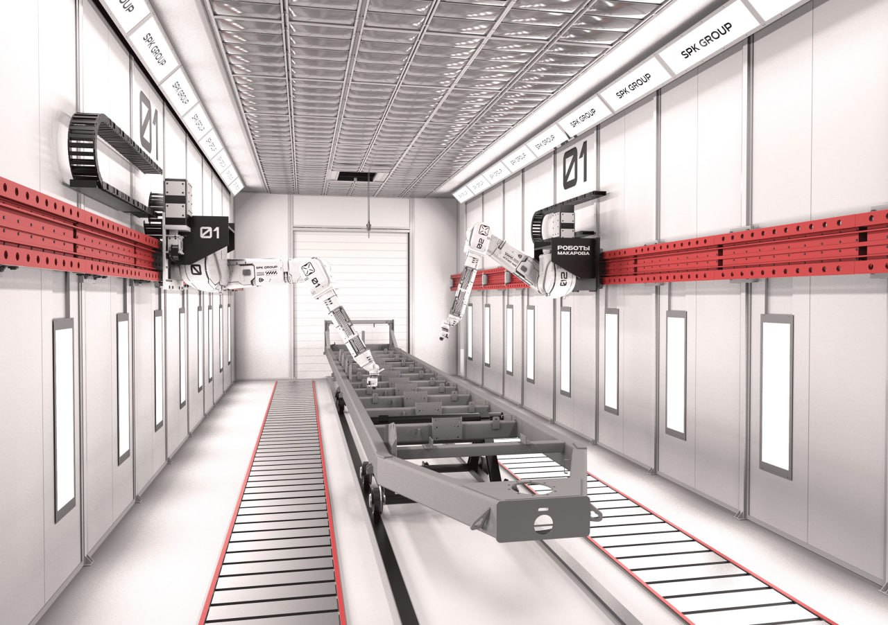 Сегодня в приоритете - роботизированные окрасочные линии. Как мы встраиваем робота в окрасочный процесс, вы можете увидеть на рендерах. На картинках это кажется просто, на деле - интереснее. Чтобы внедрить робота необходимо подготовить все условия: от усиленных креплений камеры и направляющих до электрики и специального программного обеспечения. Также важно наладить процесс подачи краски роботу. Здесь на помощь приходят автоматизированные краскоприготовительного отделения, которые не только смешивают компоненты ЛКМ, но и организуют непрерывную подачу краски, а затем промывку системы по завершении окрасочных работ.