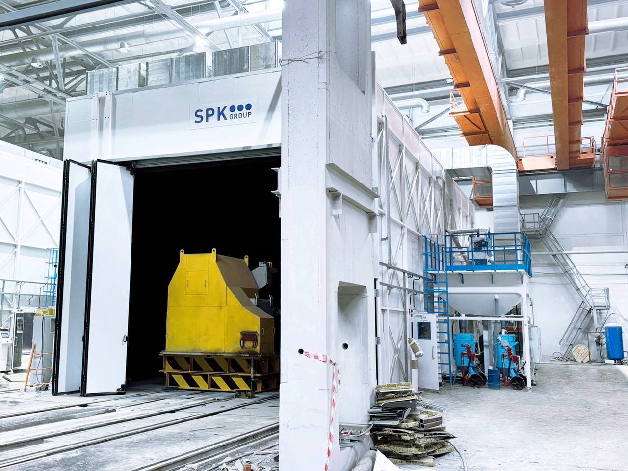 На одном из объектов SPK GROUP закончены пусконаладочные работы по одной из двух дробеструйных камер. Каждая ДСК имеет внушительные размеры: 18 х 8 х 7 м. Их особенность - автоматические складные 8-створчатые ворота (5,5 х 6,0 м) для возможности загрузки крупногабаритных изделий. Для обработки изделий на высоте предусмотрена специальная передвижная лифт-площадка. Она передвигается внутри и снаружи камеры на расстояние 35 м. Основные технические характеристики на уровне мировых стандартов: 60-кратный воздухобмен, полнорешетчатый пол, яркое освещение, 3 продольных скребка с пневматическим приводом, поперечный шнек, система рекуперации дроби с барабанным сепаратором.