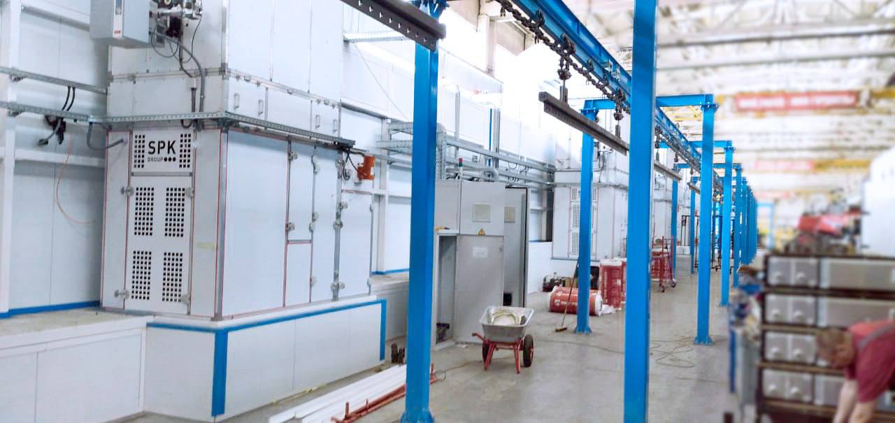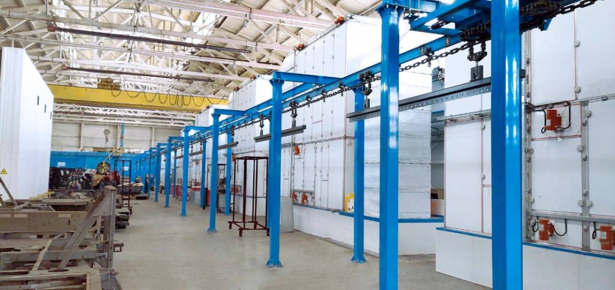 На объекте “Брянсксельмаш” ведутся пуско-наладочные работы. Здесь мы установили конвейерную линию окраски для деталей сельскохозяйственной техники. Конвейера сразу два - напольный длиной 102 метра с максимальной нагрузкой до 10 тонн. И подвесной монорельсовый конвейер с электроприводом длиной 215 м и грузоподъемностью до 300 кг/м. Он оснащен двумя приводными блоками мощностью 3 кВт каждый и автоматикой для защиты от перегрузки и заклинивания. Общая длина окрасочно- сушильного комплекса 72 м.