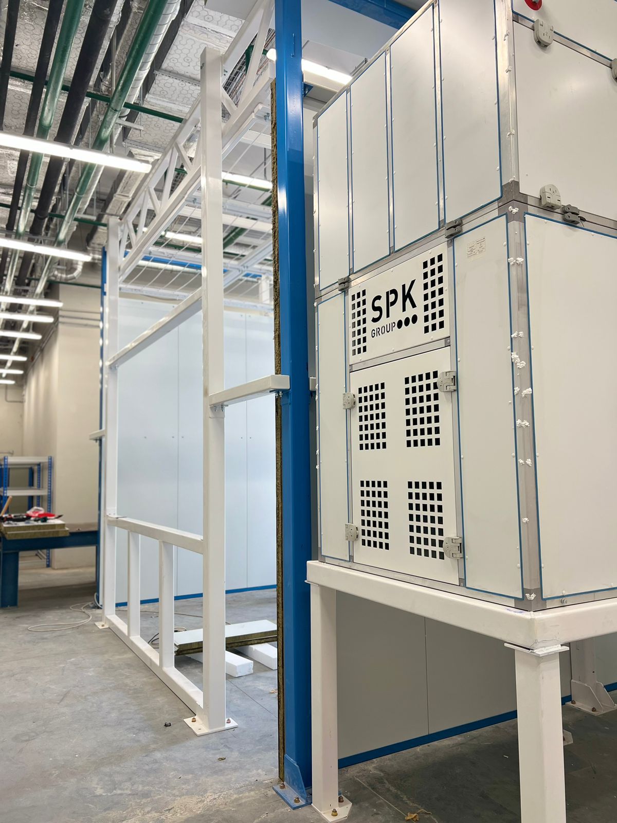 Металлокаркас ОСК с порошковым покрытием, облицованный сэндвич-панелями толщиной 50 мм. Основные ворота — ПВХ-роллетные, размеры 3000 х 3000 мм. В комплект входит сервисная дверь с доводчиком, размером 800 х 2000 мм. Освещение обеспечивают верхние и боковые светодиодные светильники. Также установлены аварийные световые индикаторы: «Выход» и «Автоматика не работает». Внутри смонтирован потолочный тонкий фильтр и стекловолоконный краскоостанавливающий фильтр с классом очистки GЗ. Вентиляционная система включает взрывозащищённый агрегат SPK-VU-15 с расходом воздуха 15 000 м³/ч, водяной медно-алюминиевый теплообменник и гидравлический водосмесительный узел с регулирующей и отсекающей гидравликой. В системе установлен утеплённый морозостойкий воздушный отсекательный клапан и комплект автоматики. Управление камерой осуществляется через программируемый логический контроллер. Предусмотрены точки быстрого подключения сжатого воздуха с фильтрацией и осушением. Для пожаротушения используется порошковая автоматическая система.