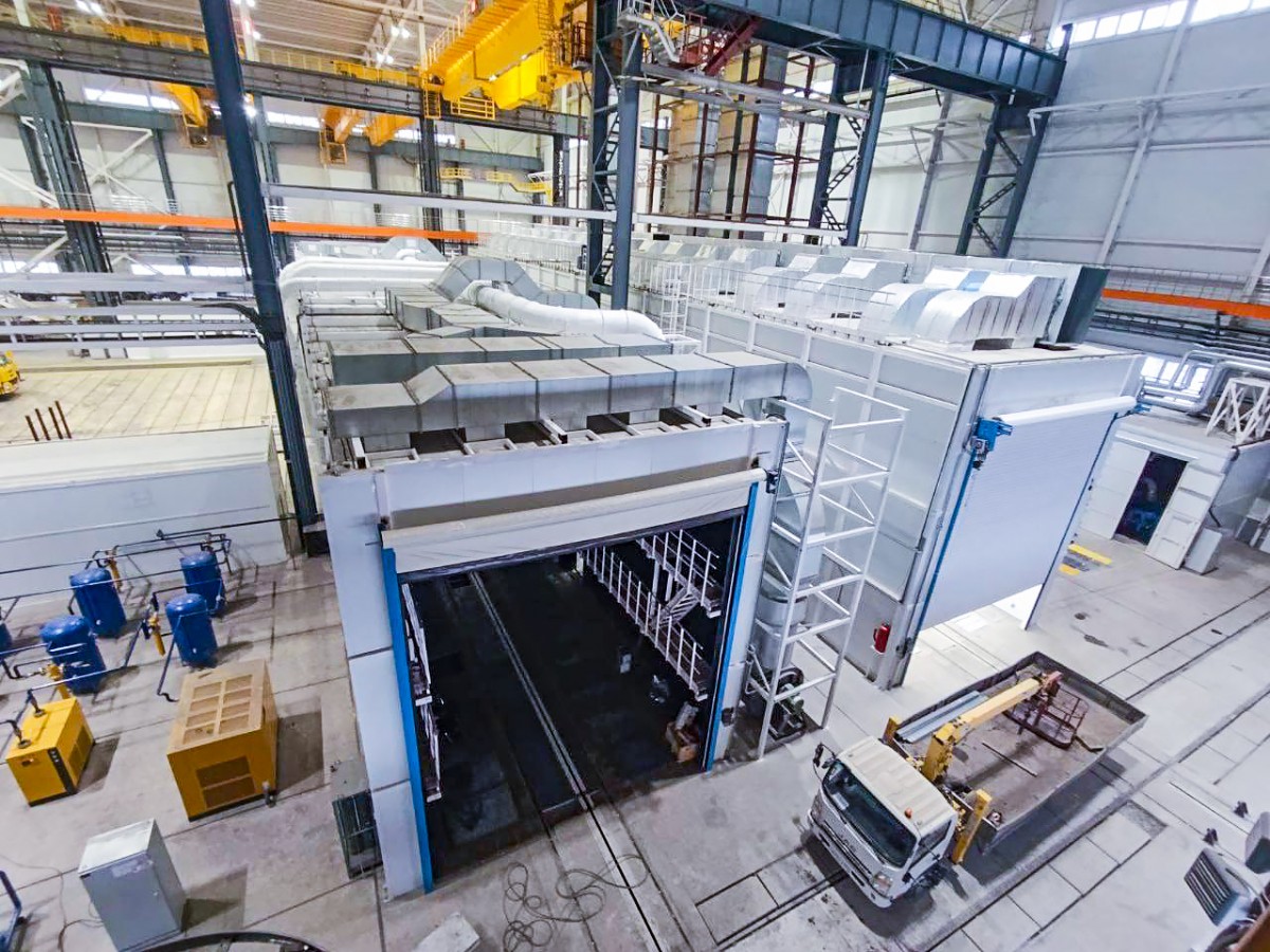 Камера проходного типа. Внутренние габариты: 45000 х 7000 х 8000 мм. Роллетные ворота из ПВХ размером 6000 х 8300 мм. 4 сервисные двери. Для перемещения операторов предусмотрены настенные стационарные галереи в 2 яруса. 4 вентиляционно-фильтровальные установки с общей производительностью 100000 м3/ч. 2 системы сбора дроби. 2 системы рекуперации дроби с 4-мя напорными агрегатами. 8 дробеструйных постов. Предусмотрено 4 рельсовых телеги грузоподъемностью каждая по 15 т. Общая мощность камеры - 142 кВт.