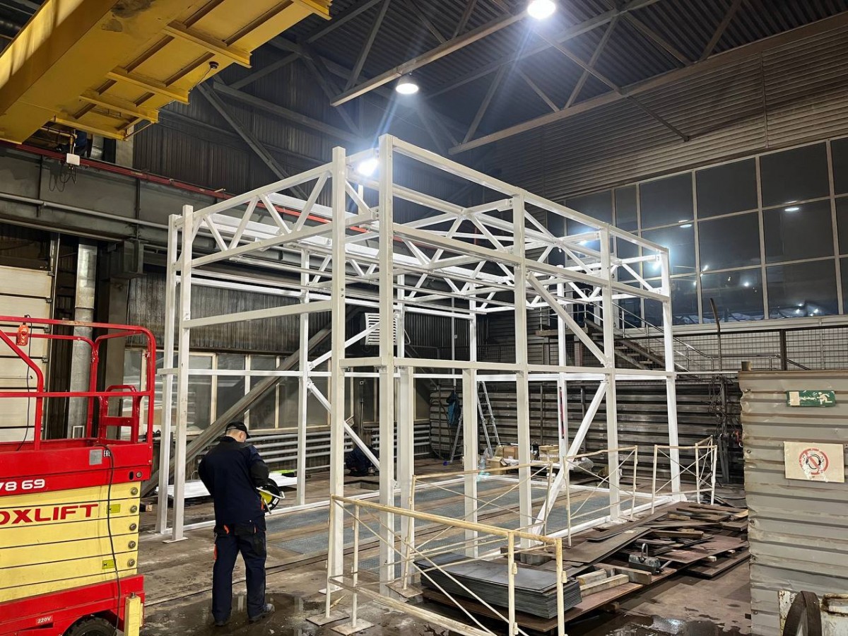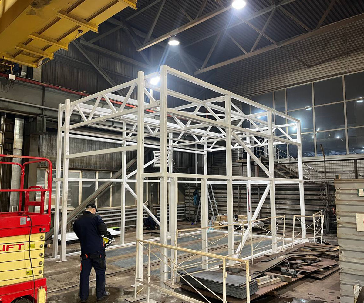 Рабочая зона камеры сформирована металлическим силовым каркасом, обшитым сэндвич-панелями толщиной 100 мм с заполнением из минеральной ваты на основе базальтового волокна, что обеспечивает эффективную теплоизоляцию и соответствие требованиям пожарной безопасности. Внутренние габариты составляют 4300 × 2800 × 3000 мм.