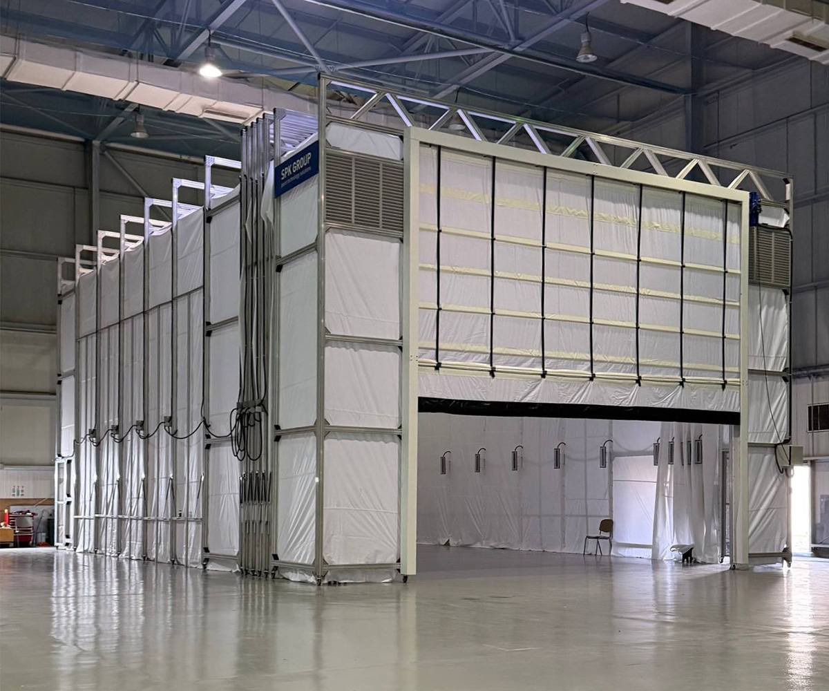 Складная окрасочная камера тупикового исполнения SPK предназначена для подготовки изделий к окрашиванию и нанесению на них лакокрасочных покрытий. Камера обеспечивает равномерный поток воздуха, взятого из помещения ангара, где расположена камера. Поток воздуха направлен по диагонали по длине камеры.