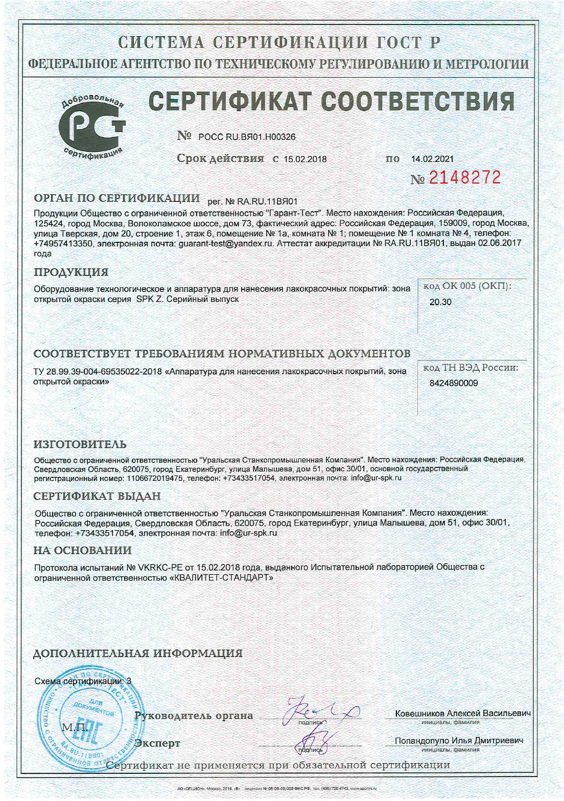 СЕРТИФИКАТ НА УЛИЧНУЮ ОКРАСОЧНО-СУШИЛЬНУЮ КАМЕРУ |