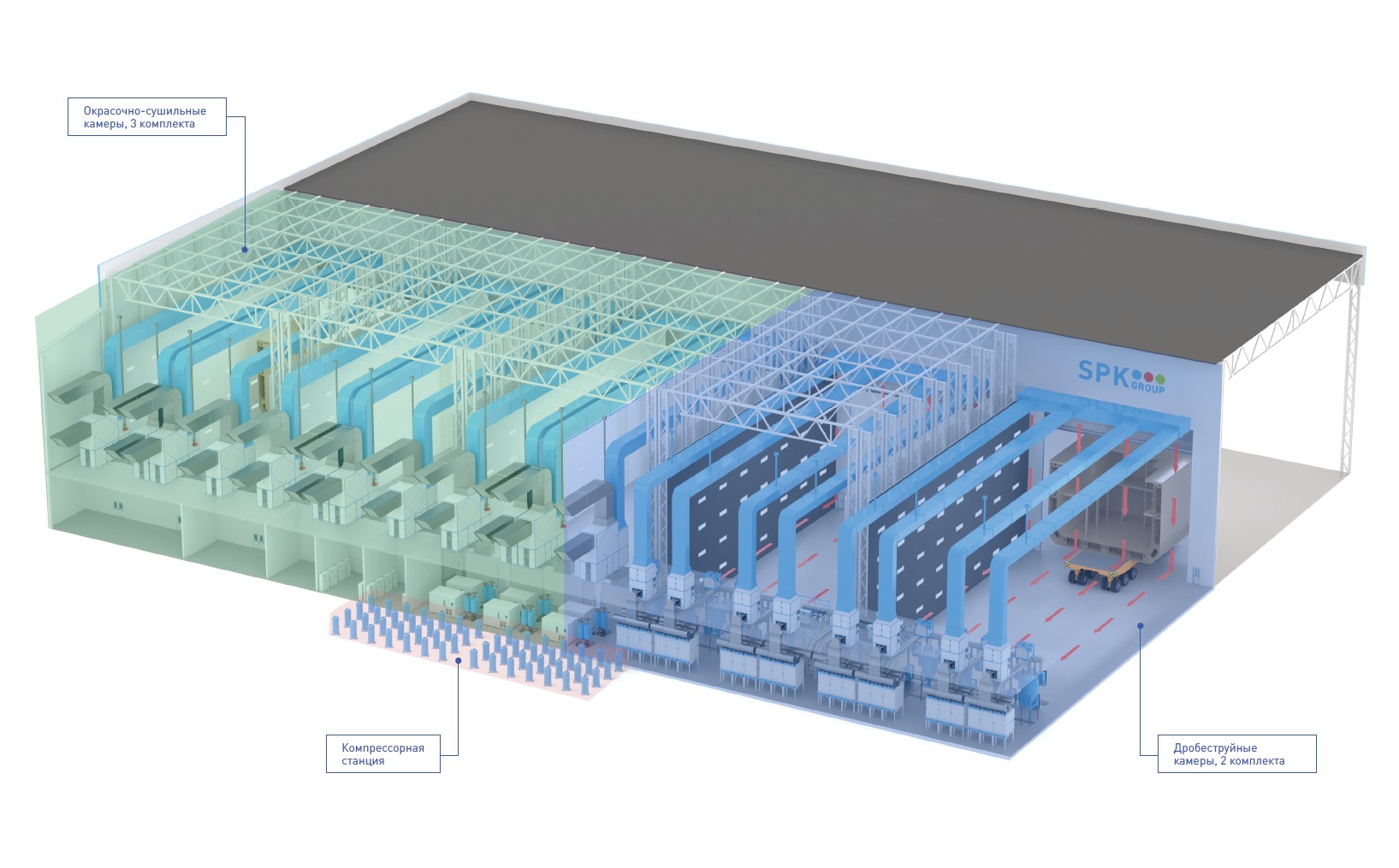 Этот комплекс состоит из пяти камер тупикового типа внутренних размеров 40 м (длина) х 22,5 м (ширина) х 20 м (высота). В него входят две дробеструйные и три окрасочно-сушильные камеры. К ним пристроены отделения КПО, АБК, а также помещение для размещения технологического оборудования на двух этажах и навес для предварительной подготовки изделий перед очисткой и окраской. Общие размеры здания — 106 м (длина) х 132 м (ширина) х 28 м (высота).