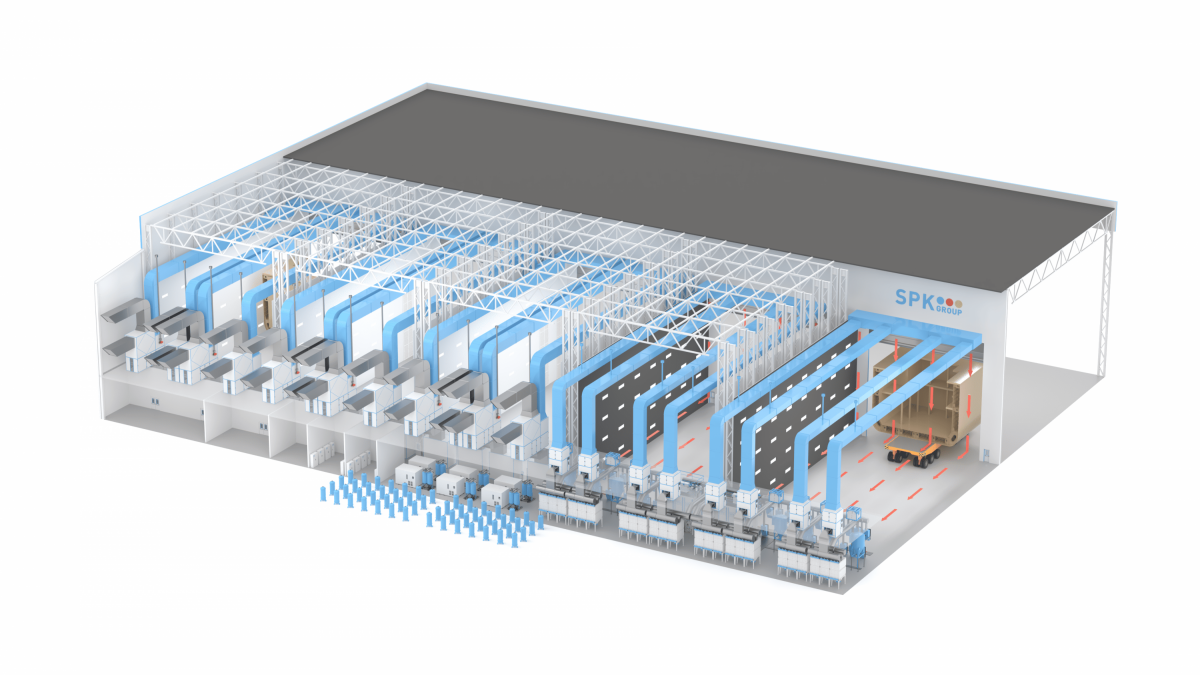 Для сбора дроби из внутренних полостей изделий применяется вакуумная система SPK-VTB-75. Собранная дробь отсеивается в специальном бункере, после чего перемещается на шнековый конвейер SPK-SCS(SC), далее — на ленточный конвейер SPK-CS, и затем — в приемник элеватора SPK-BBE.
