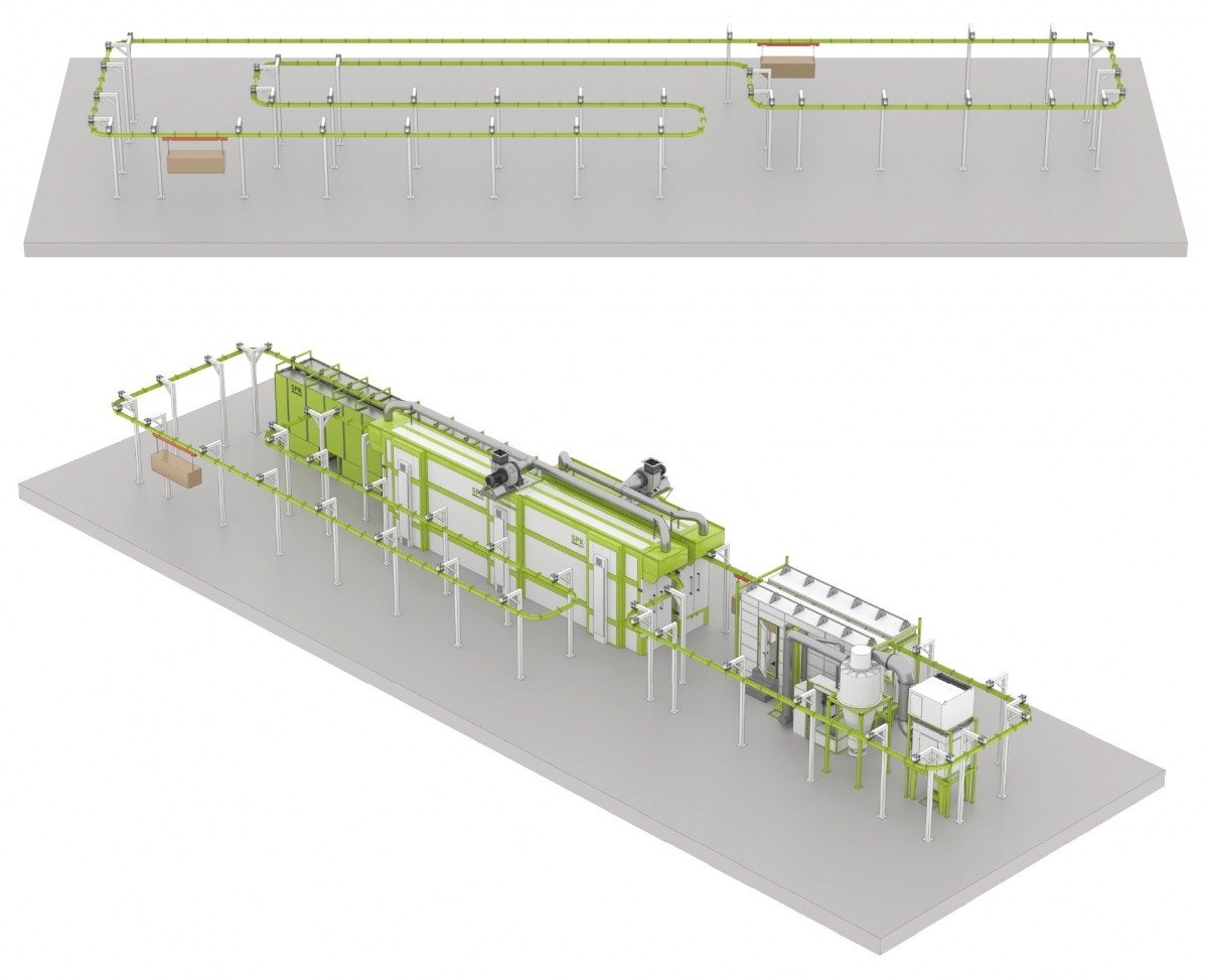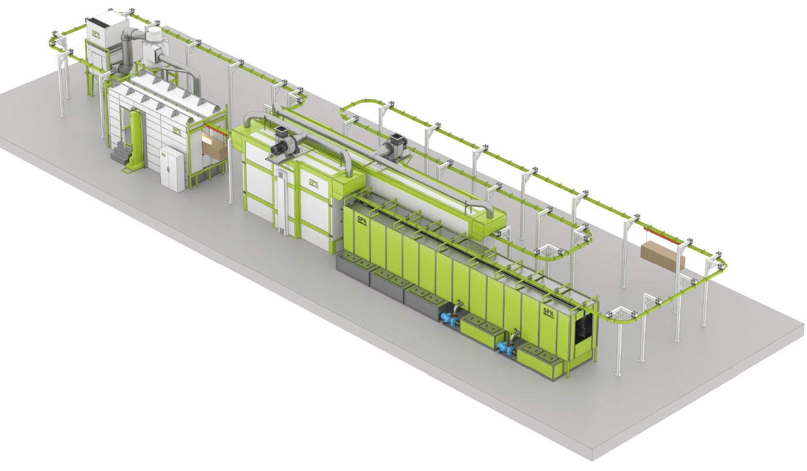 Автоматическая линия для подготовки поверхности и порошковой окраски предназначена для предварительной обработки поверхности, нанесения порошкового покрытия методом электростатического напыления и формирования защитного слоя на внешних и внутренних поверхностях корпусных, рамных и иных деталей. Линия функционирует в тактовом режиме.