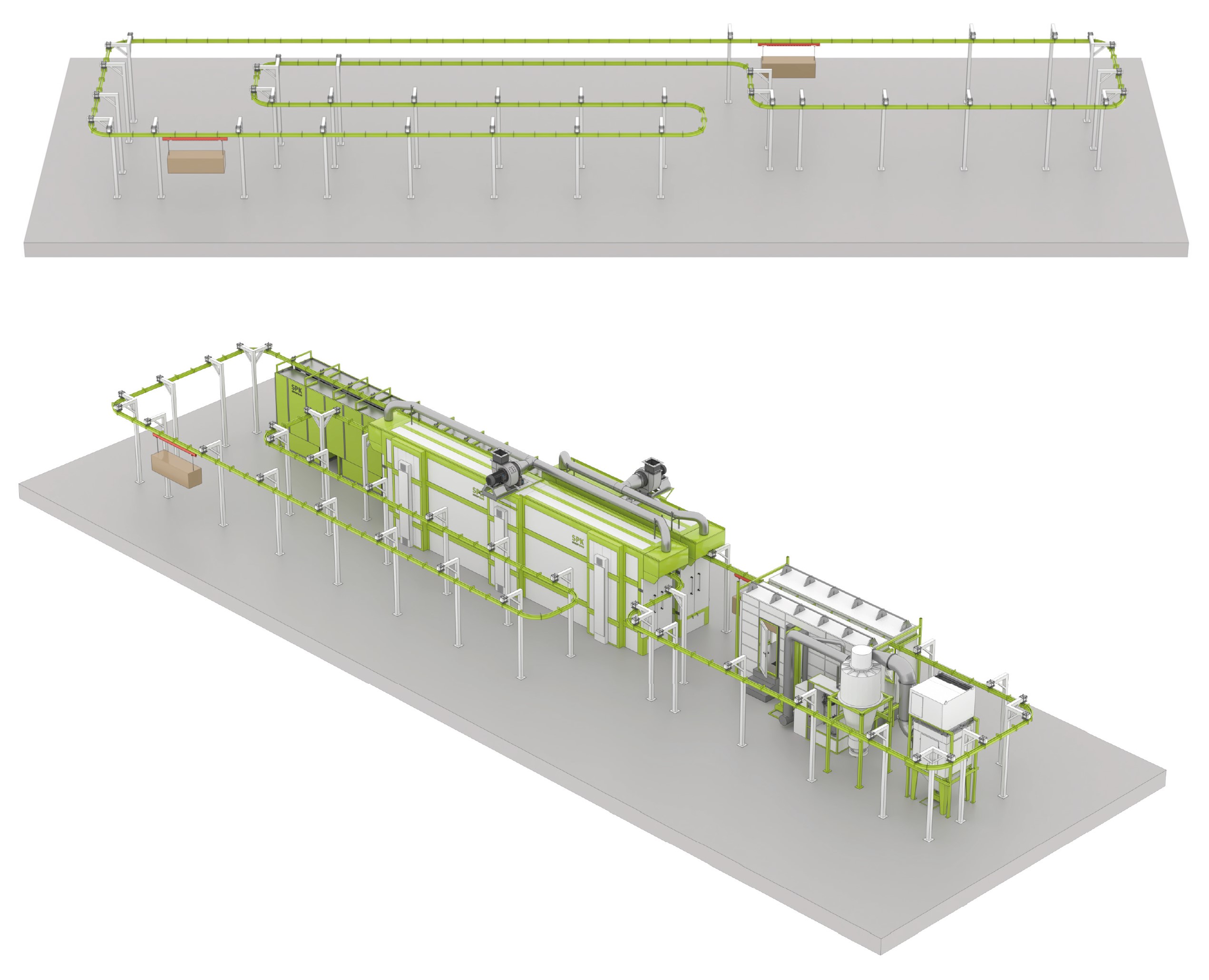 Конвейер представляет собой металлический профиль с внутри расположенной карданной цепью на роликах с подвесными крюками, шаг которых составляет 400 мм. Цепь свободно перемещается как в горизонтальной, так и в вертикальной плоскости благодаря профильным кривым и может перемещаться вдоль желоба. Вращение цепи обеспечивается приводной станцией, а контроль и управление осуществляются из центрального шкафа управления. При движении по линии каждый крюк оборудован поворотным механизмом в виде шестерни с опорным подшипником. В автоматическом режиме подвески вращаются внутри камеры нанесения краски.