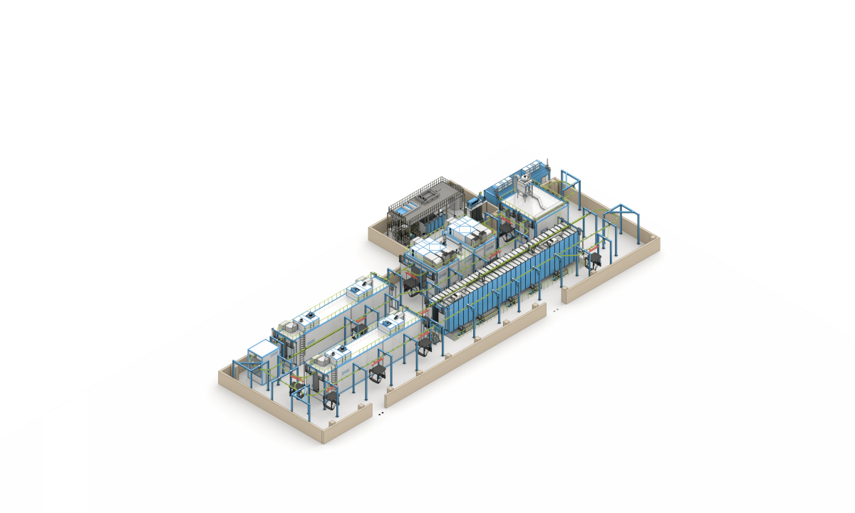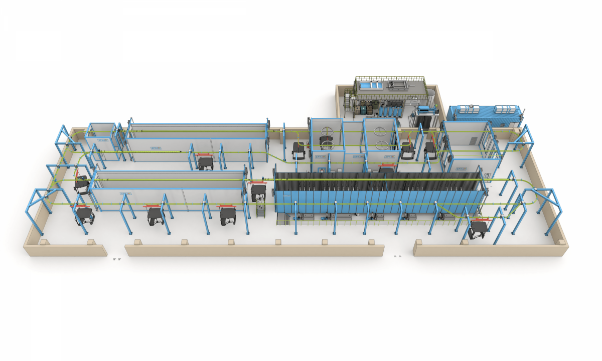 - Ручной монорельсовый конвейер SPK-CS.ОММ, оборудованный четырьмя элеваторами для загрузки/выгрузки изделий и автоматическими протяжками в зонах АХПП, сушки и охлаждения.