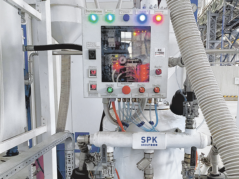 В дробеструйных камерах производства SPK для экономии места и увеличения производительности и скорости обработки поверхности изделий возможно применение напорного агрегата непрерывного действия на 2-х операторов BPСО.020.2.02.01 объемом 250 л. Данный напорный агрегат оснащен пневмоэлектрическим шкафом управления с возможностью регулирования давления в напорной линии каждого из операторов, счетчиком моточасов каждого оператора, режимом обдува изделий сжатым воздухом включением каждого из операторов по отдельности. Также оснащается автоматическим режимом загрузки рабочей камеры напорного агрегата для непрерывной работы операторов и возможностью переключения в ручной режим. Имеет ручку управления оператора с электроуправлением, что сокращает время реакции и начала подачи абразива в напорную линию оператора из резервуара.