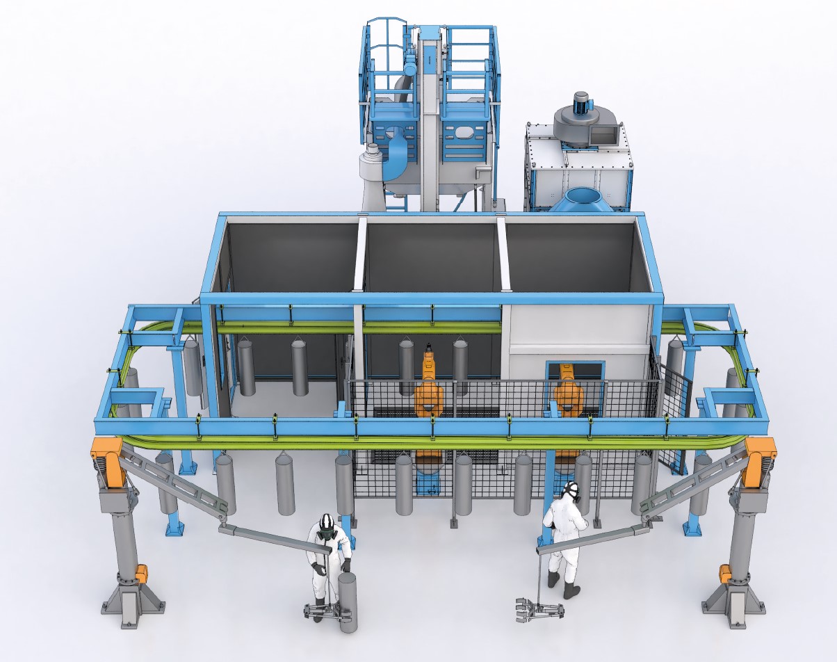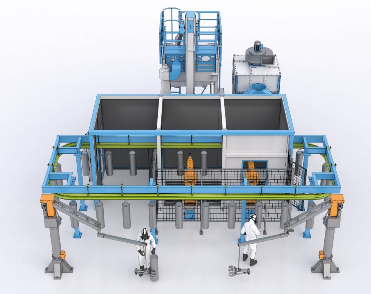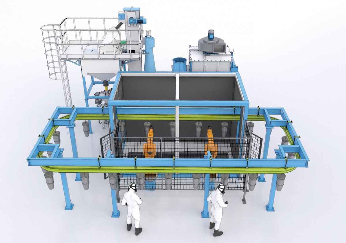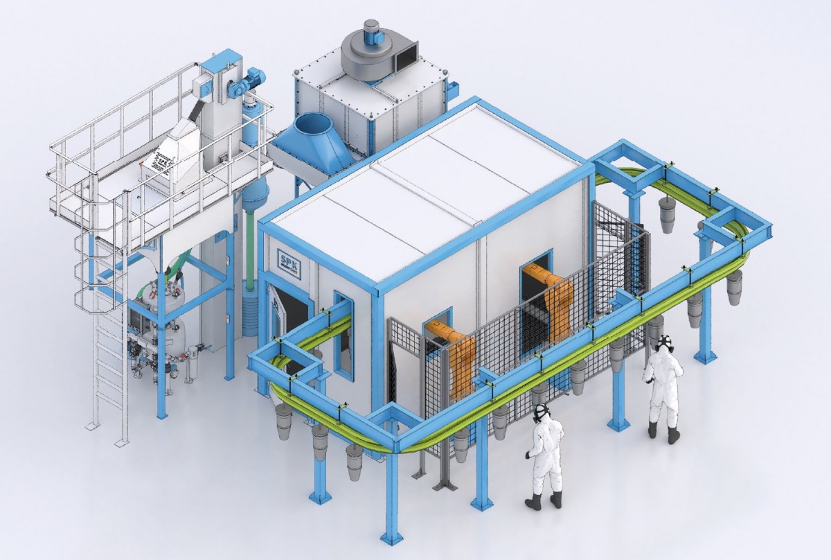 Силовой каркас камеры с защитным покрытием. Ограждающие сендвич-панели с наполнением из минераловатной плиты. Сервисная дверь. Абразивостойкая светодиодная система освещения. Вентиляционно-фильтрационная установка SPK-VFU-100. Вытяжные отбойные щиты. Воздуховоды циркуляционные. Продольный и поперечный конвейеры. Система сбора и рекуперации дроби. 2-постовой напорный агрегат SPK для одновременной и непрерывной работы двух дробеструйных сопел. Робот-манипулятор с контроллером управления.