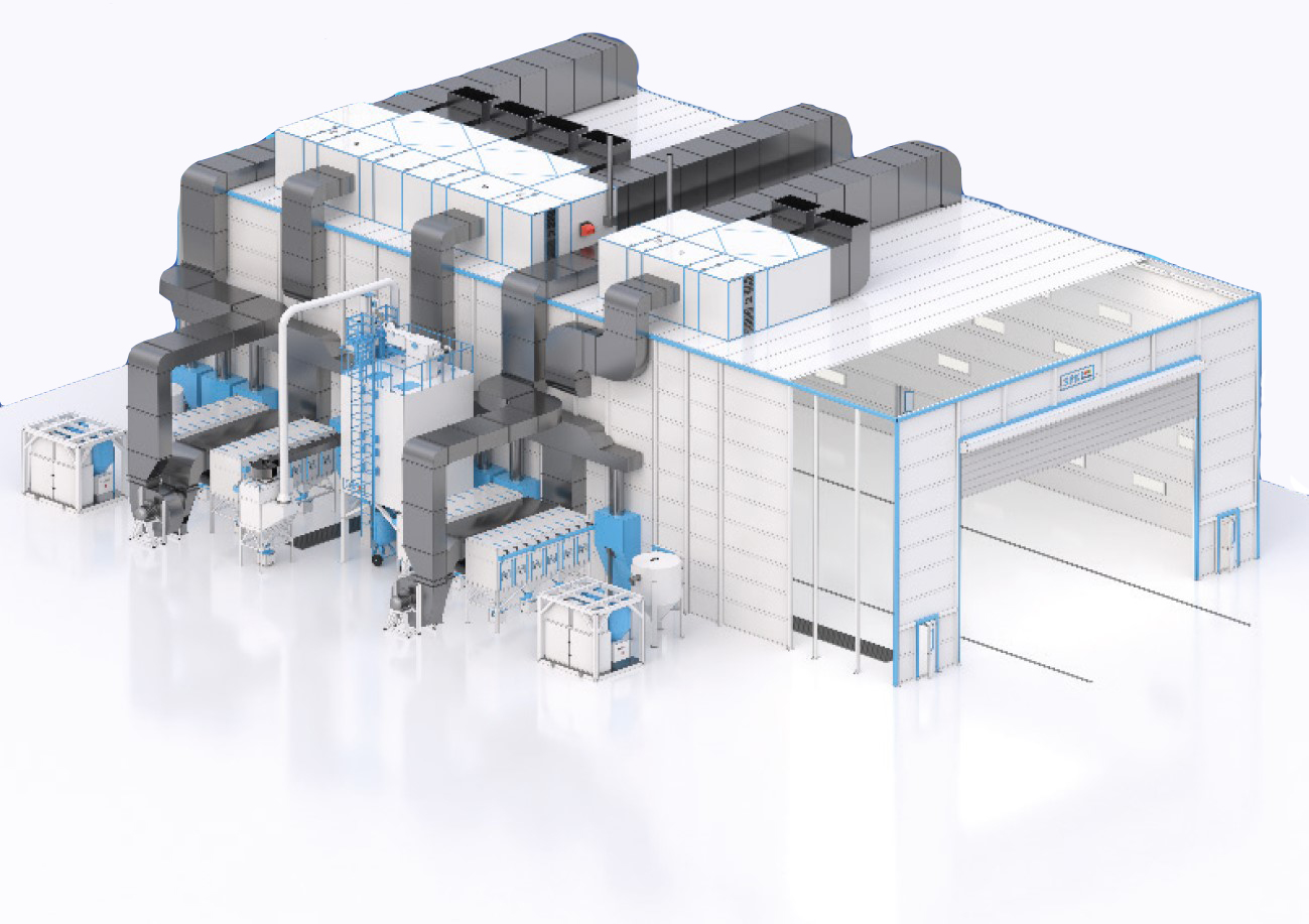 Дробеструйно-окрасочно-сушильная камера SPK-SBSCB-36.18.10 представляет собой комбинированное оборудование, предназначенное для проведения процессов дробеструйной обработки, окраски и сушки изделий как отдельных судовых блоков, так и собранных в сборе. Изделия перемещаются внутри камеры с помощью тележки с гидравлическим подъемником, а для обработки изделий на высоте используются быстроустанавливаемые леса.