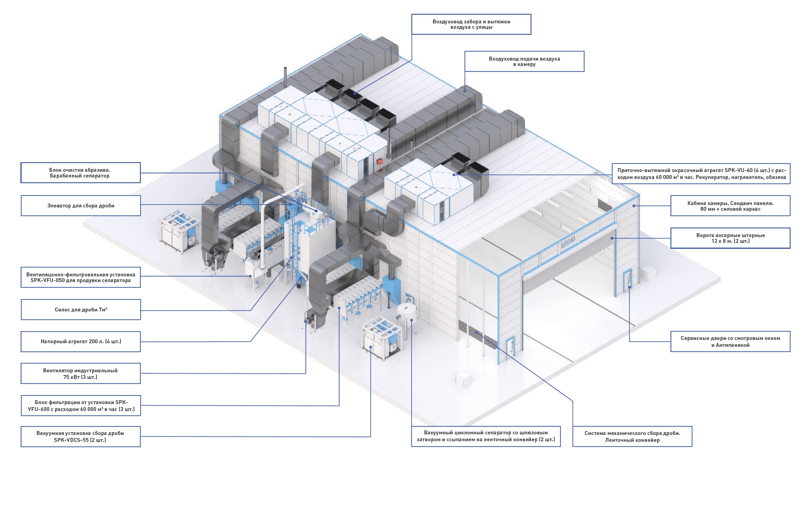 Основные технологические операции, выполняемые в камере, включают маскировку поверхностей, не требующих обработки, дробеструйную очистку металлоконструкций от окалины и ржавчины с целью активации поверхности и повышения шероховатости для лучшего нанесения лакокрасочных покрытий, обеспыливание поверхности с помощью обдува сжатым воздухом и вакуумного сбора дроби из внутренних полостей изделия. Также осуществляется окраска изделий безвоздушным методом в несколько слоёв (грунт, грунт-эмаль, эмаль) с промежуточной сушкой, высокотемпературная сушка готовых изделий, дефектовка качества лакокрасочного покрытия и устранение выявленных дефектов, а также снятие маскировки.