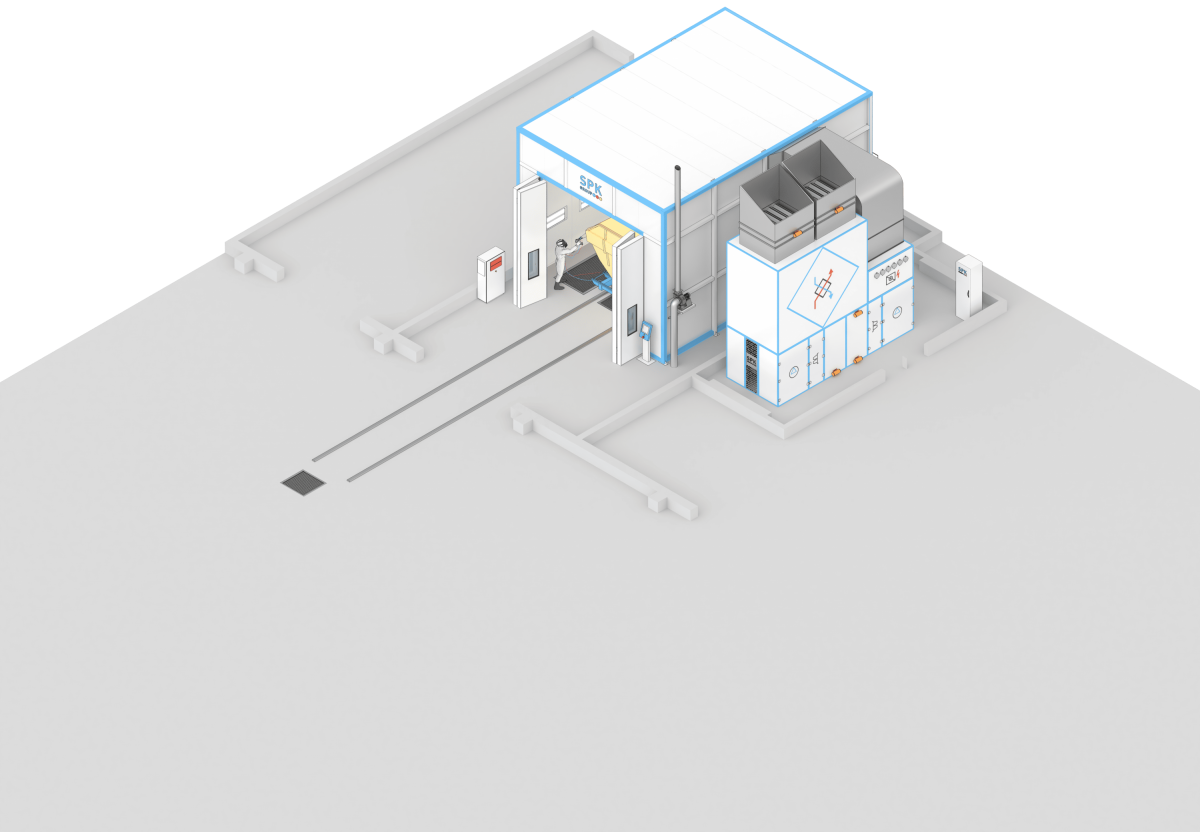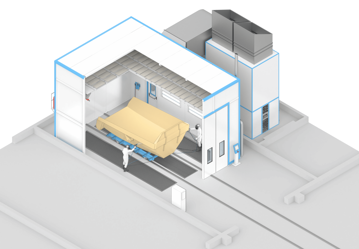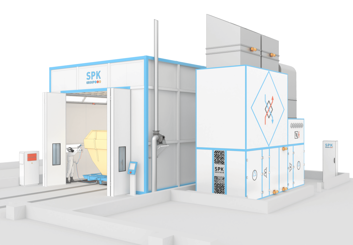 Окрасочно-сушильная камера тупикового типа SPK-SCB-10.6.5 (далее — ОСК) предназначена для подготовки изделий к покраске, нанесения лакокрасочных материалов и их сушки при повышенной температуре. Внутри камеры создаётся равномерный поток подогретого и очищенного воздуха, движущегося сверху вниз. Для очистки воздуха от остатков краски используется сухой тип фильтрации, что способствует качественному нанесению покрытия и исключает необходимость установки дополнительных очистных систем.