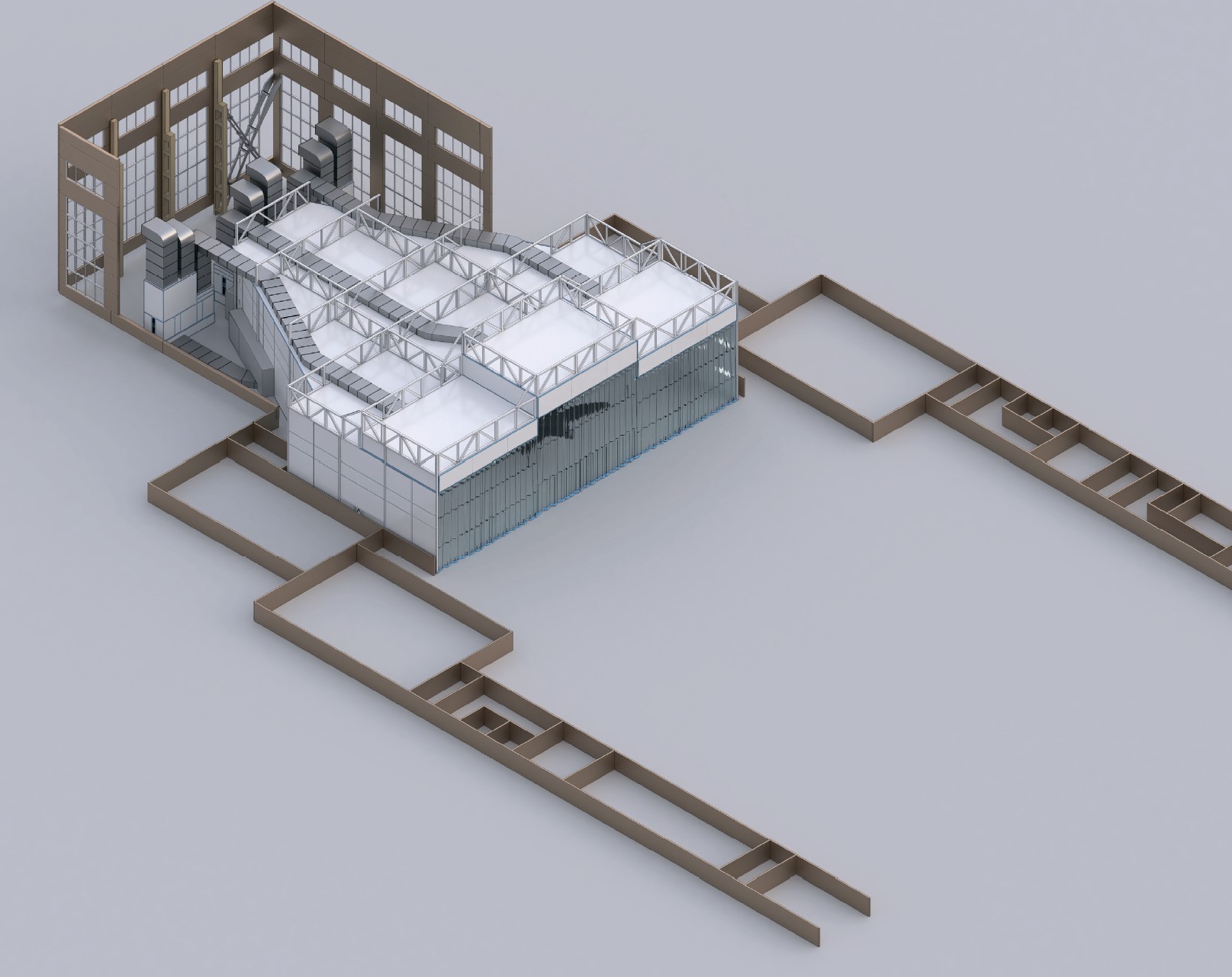 Постамент под приточно-вытяжной агрегат, с воздуховодом до фильтрационной стены.