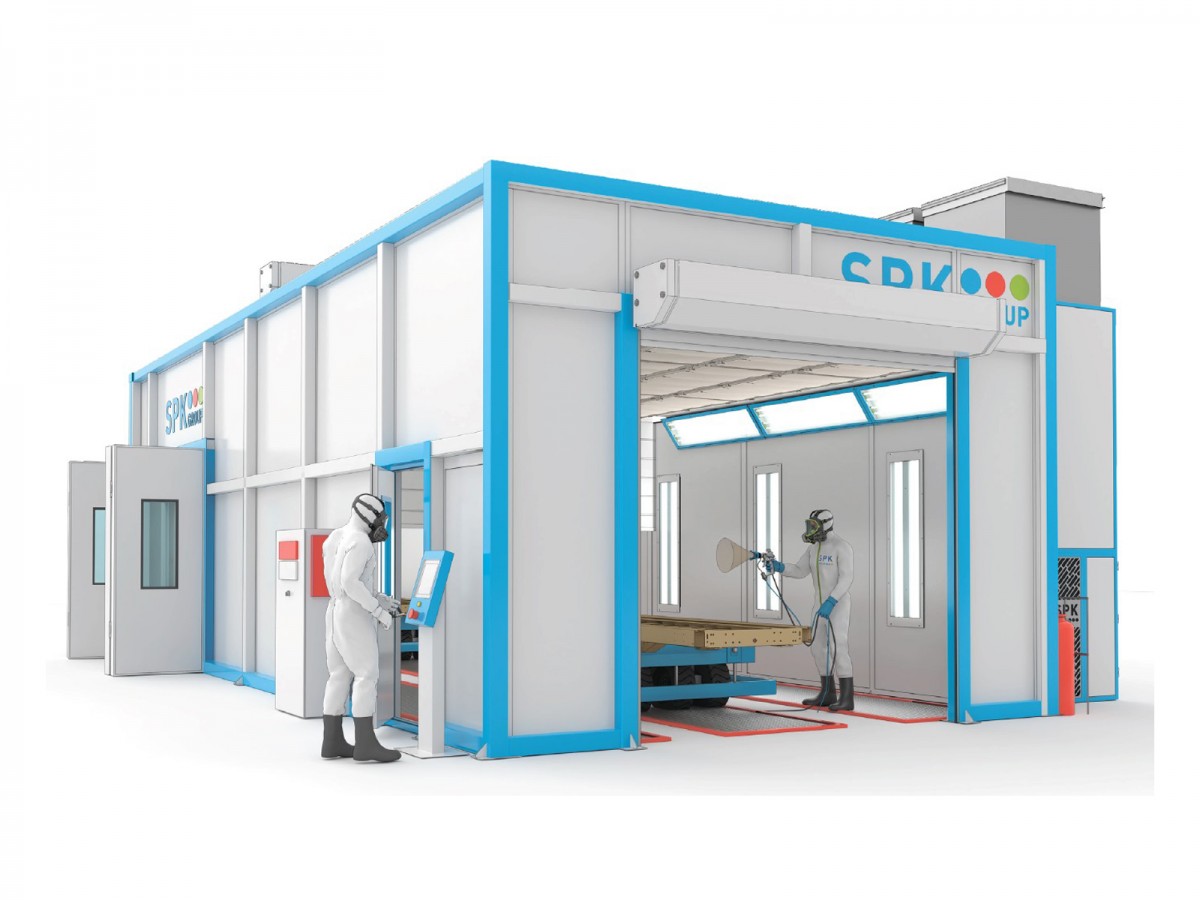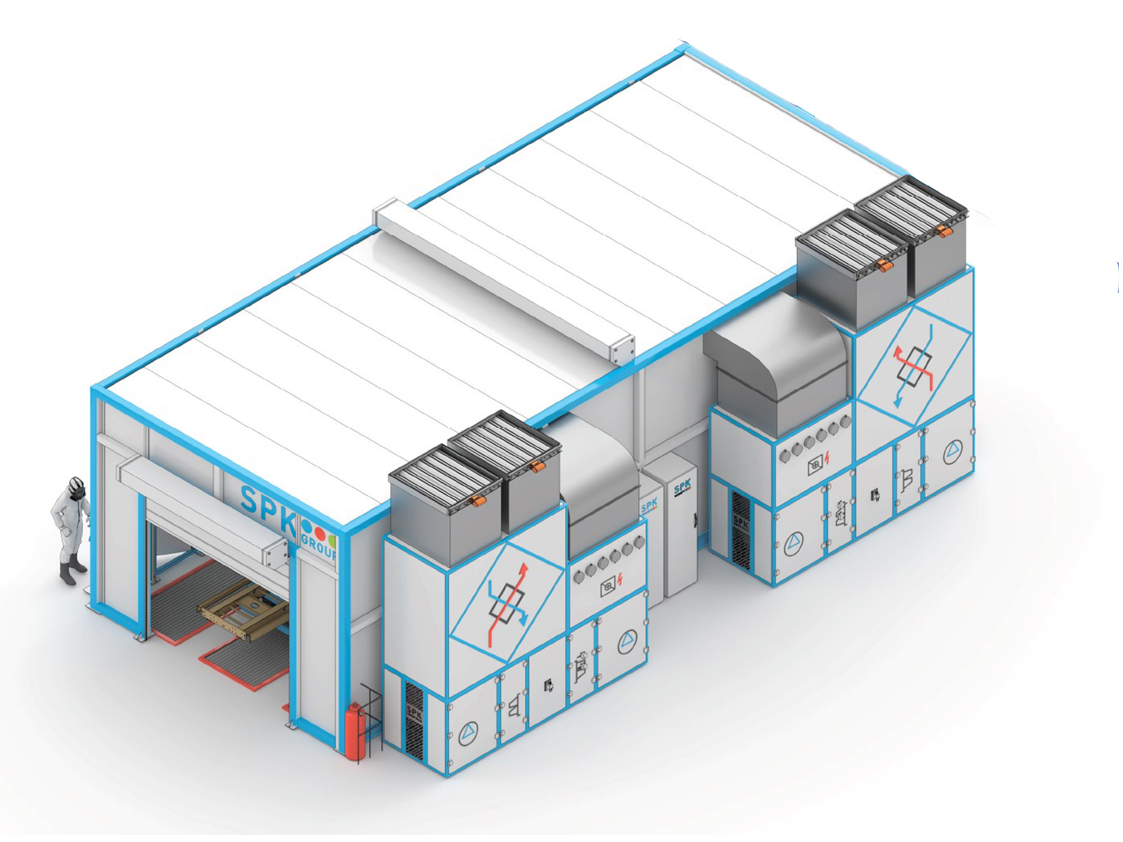 Двухсекционная окрасочно-сушильная камера тупикового типа SPK-SCB-12.5.3 предназначена для подготовки поверхности, нанесения лакокрасочных покрытий методом безвоздушного распыления и последующей сушки изделий различного профиля. Общая мощность электроэнергии камеры — 63 кВт, включая вентиляторы, освещение, приводы ворот, вентилятор компрессора и шкаф управления. При наружной температуре -23°C потребление нагревательных секций составляет около 228 кВт.