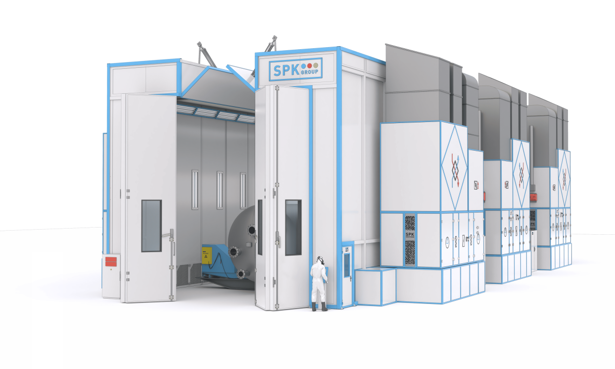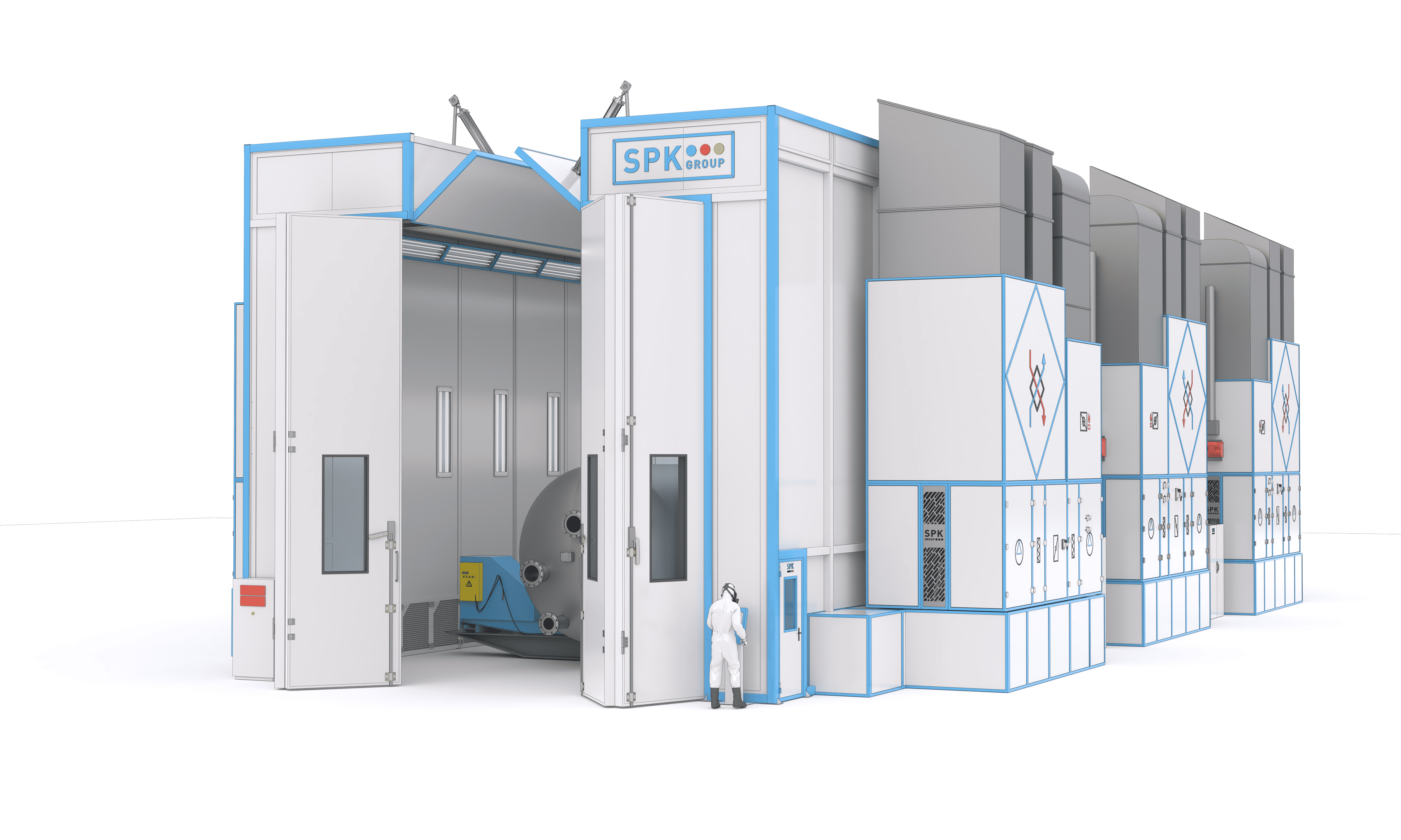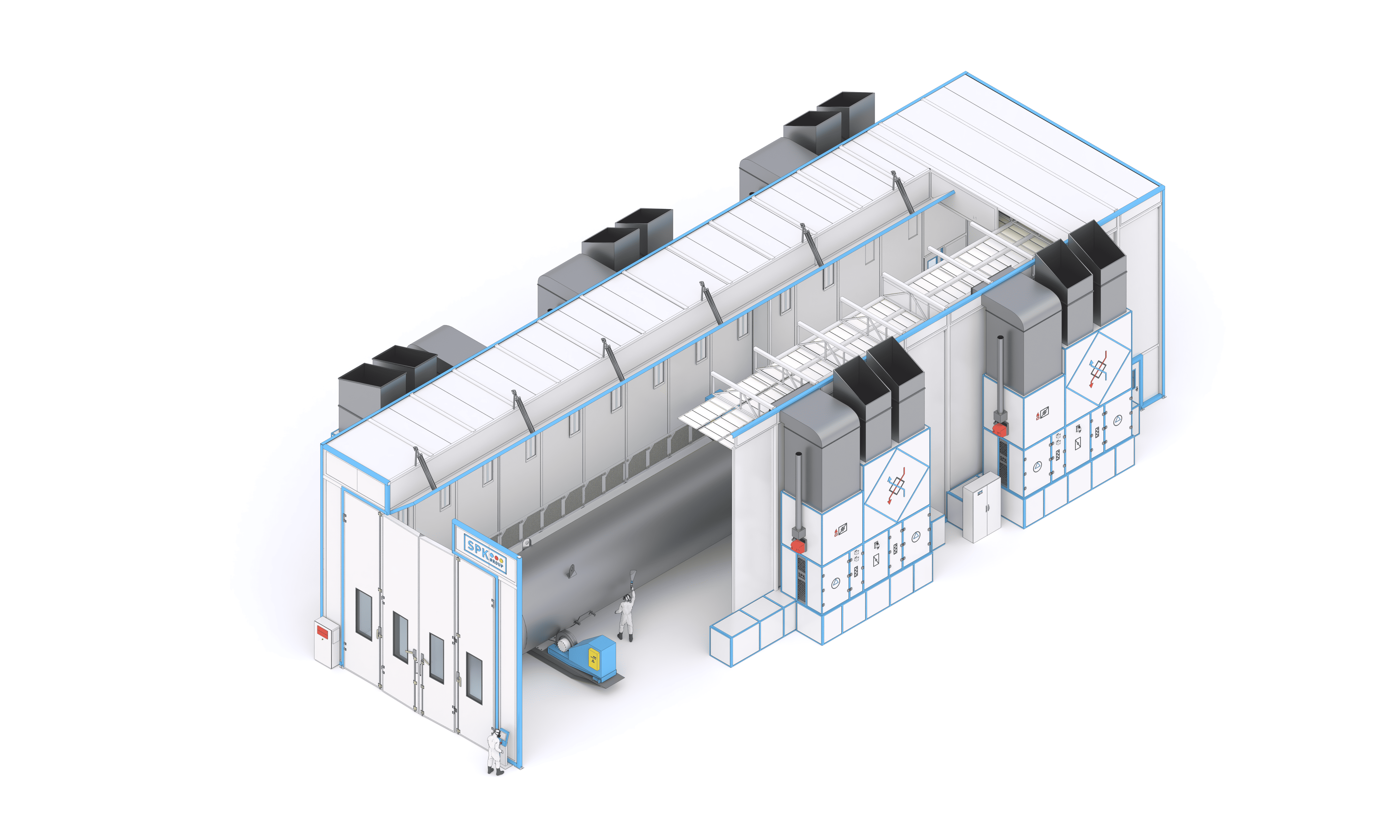 Окрасочно-сушильная камера тупикового типа SPK-SCB-20.5.4 предназначена для предварительной подготовки изделий перед покраской, нанесения лакокрасочных покрытий и их последующей сушки при повышенной температуре. Внутри камеры обеспечивается равномерный поток очищенного и подогретого воздуха с направлением сверху вниз. Камера использует сухую фильтрацию воздуха от остатков краски, что способствует качественному нанесению лакокрасочного слоя и устраняет необходимость установки дополнительных очистных сооружений.