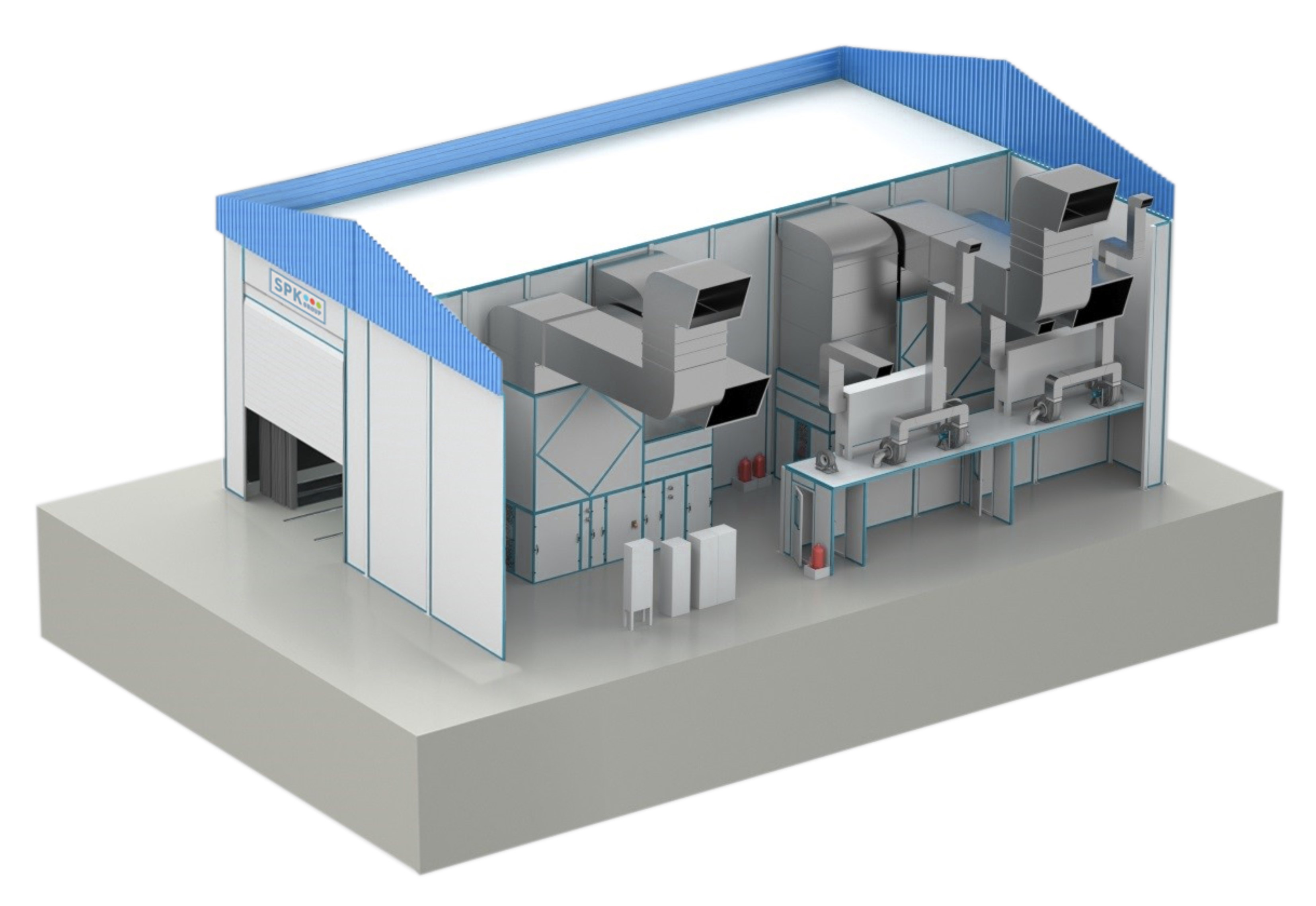 Окрасочно-сушильная установка уличного типа (климатический класс — У1) предназначена для подготовительных операций перед покраской изделий (например, протирка и обезжиривание с помощью растворителей), а также для нанесения лакокрасочных и защитных покрытий (жидких ЛКМ). Обработка изделий выполняется на рельсовой платформе с тросовым приводом (саму тележку можно приобрести дополнительно). Устройство рельсового пути, приямки для монтажа привода тележки, а также канал для троса, включая необходимые закладные и монтажные элементы, — зона ответственности Заказчика.