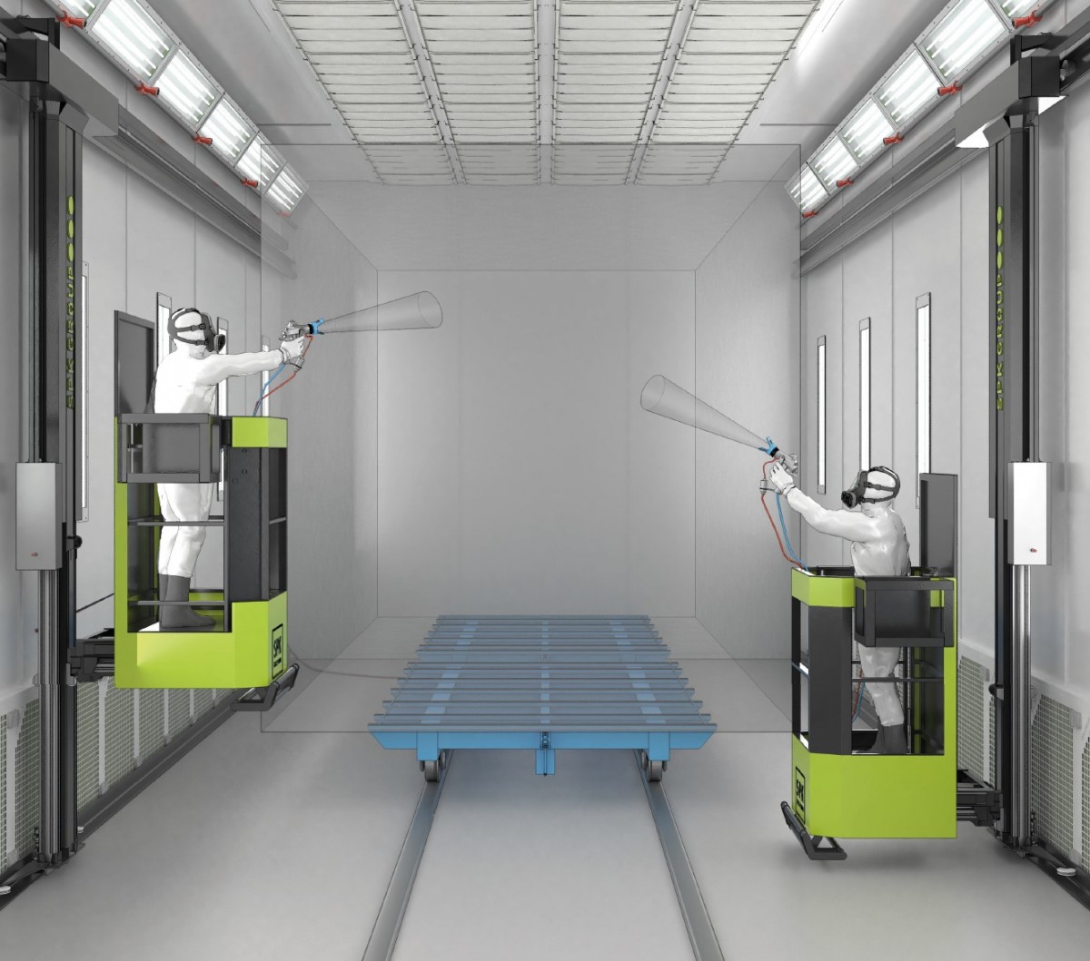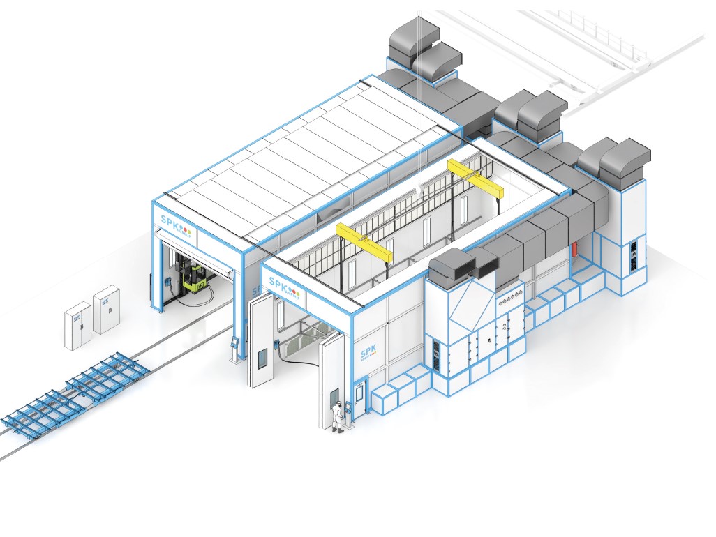 Вторая секция включает в себя: металлокаркас с комплектующими для сборки — 1 комплект; приспособления для развешивания мелких окрашиваемых деталей — 1 комплект; сэндвич панель с комплектующими для сборки — 1 комплект; въездные распашные ворота — 1 комплект; сдвижные ворота в крыше камеры — 1 комплект; сервисная дверь размером (Ш х В): 800 х 2000 мм — 1 штука; боковые взрывозащищённые светодиодные светильники IP65 — 1 комплект; приточный коллектор с потолочным фильтром класса очистки М5 — 1 комплект; вытяжные короба с рулонным фильтром G3 «краскоостанавливающий» — 1 комплект; вентиляционная приточно-вытяжная установка SPK-VU-35 с кассетными фильтрами G4, взрывозащитой двигателей и искрозащитой рабочих колес, расход воздуха 35 000 м³/ч — 2 штуки; электрический теплообменник в общепромышленном исполнении — 2 штуки; пластинчатый рекуператор — 2 штуки; воздушный клапан отсекающий — 4 штуки; шкаф автоматики IP54 (общепромышленного исполнения) с кабельной продукцией — 1 комплект; сенсорная панель управления — 1 штука; газоанализаторы — 1 комплект; блок подготовки с одноступенчатым фильтром для сжатого воздуха и выходами на два пневмоинструмента — 2 штуки; автоматическая система пожаротушения порошкового типа (включая проект АУПТ) — 1 комплект; запасные части и расходные материалы на два года — 1 комплект; план-схема расстановки оборудования с указанием точек подключения энергоресурсов (электроэнергия, сжатый воздух) — 1 комплект; принципиальные электрические и пневматические схемы — 1 комплект; паспорт, руководство по эксплуатации и копия сертификата — 1 комплект.