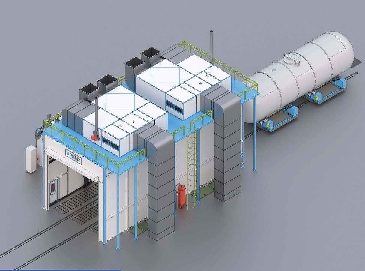 В процессе работы изделия загружаются с помощью двойной тележки, оснащенной электролебедкой и бесконечным тросом. Внутри камеры обеспечивается равномерный поток подогретого и очищенного воздуха, движущегося сверху вниз, что способствует качественному покрытию поверхности. Камера использует сухую фильтрацию воздуха, что позволяет эффективно удалять остатки краски и исключает необходимость в дополнительных очистных сооружениях. Конструкция включает металлический каркас с порошковым покрытием и эстакаду с лестницей для обслуживания. В качестве стен применяются сэндвич-панели толщиной 50 мм. Ворота выполнены рулонного типа и имеют размеры 5,5х5,5 м, установлены две единицы для удобства загрузки и выгрузки. Также предусмотрены сервисные двери с доводчиками и размерами 0,8х2 м. Освещение внутри камеры осуществляется взрывозащищенными светодиодными светильниками IP65, расположенными в верхних углах и по бокам. Для отображения аварийных ситуаций установлены световые индикаторы «Выход» и «Автоматика не работает».