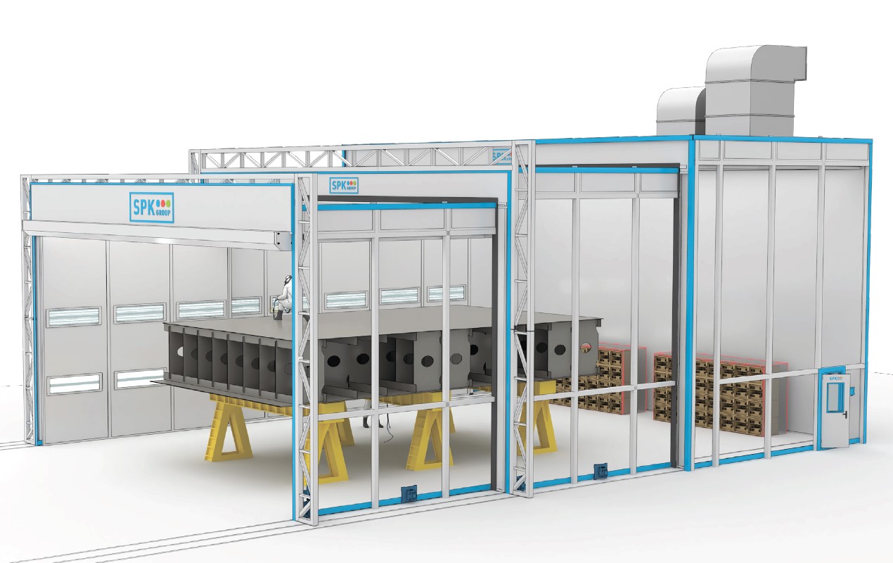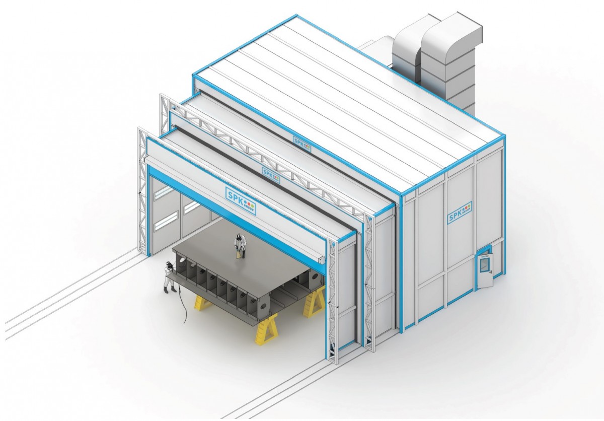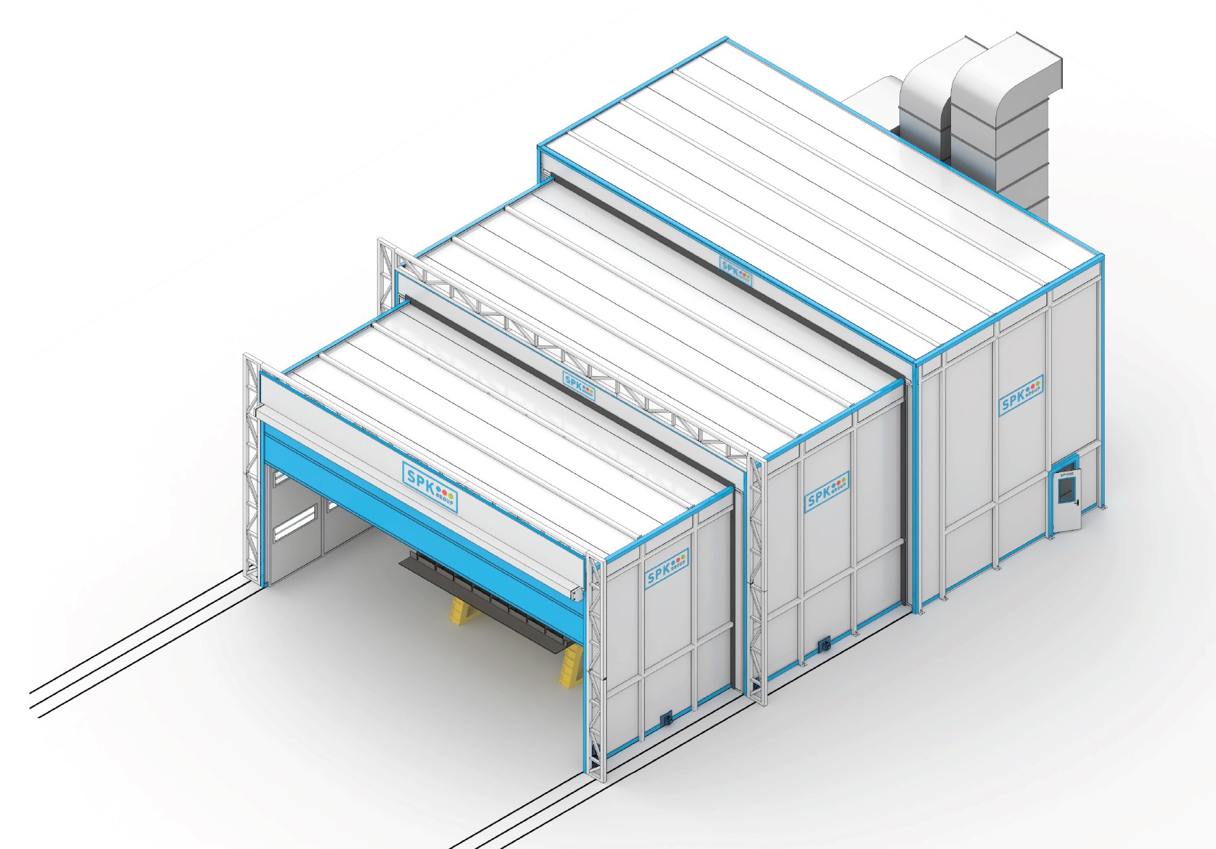 Окрасочно-сушильная камера телескопического типа SPK-SCB(Fx)-19.12.8 (далее — ОСК) предназначена для подготовки изделий к покраске, нанесения на них лакокрасочных покрытий и их сушки при повышенной температуре (40..50°C). Камера состоит из трёх секций. Одна секция стационарная и две мобильные, перемещающимся по рельсовому пути с помощью моторредукторов. Рельсы представляют из себя прут квадратного сечения (ок. 80х80), устанавливающийся вровень с нулевой отметкой. Все три секции складываются в компактное положение, чтобы не мешать внутрицеховой логистике.