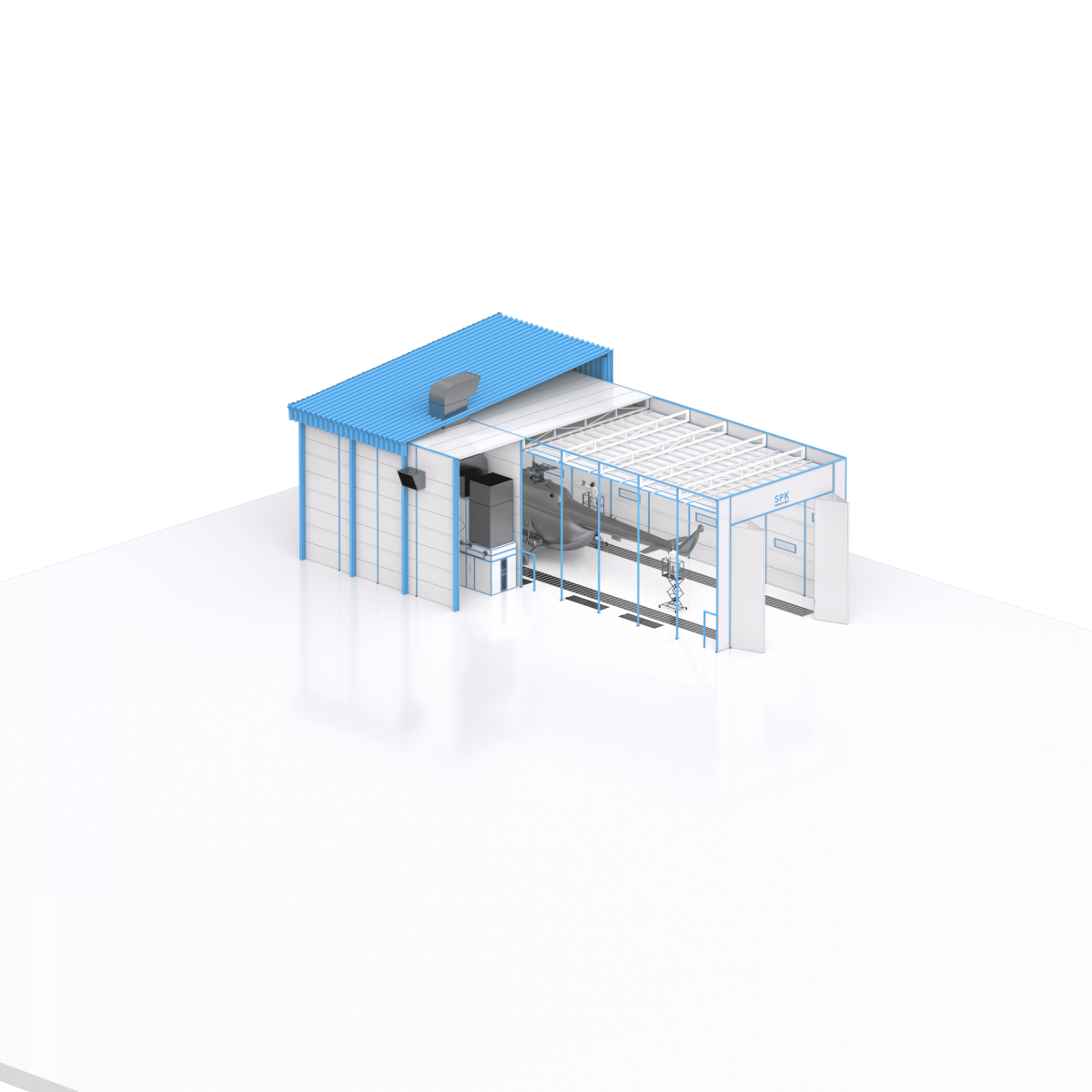 - Назначение: подготовка к окраске, нанесение ЛКП и сушка вертолетной техники в сборе (без лопастей), комплектующих изделий, валов трансмиссии вертолетной техники, при температуре до +50 °C.