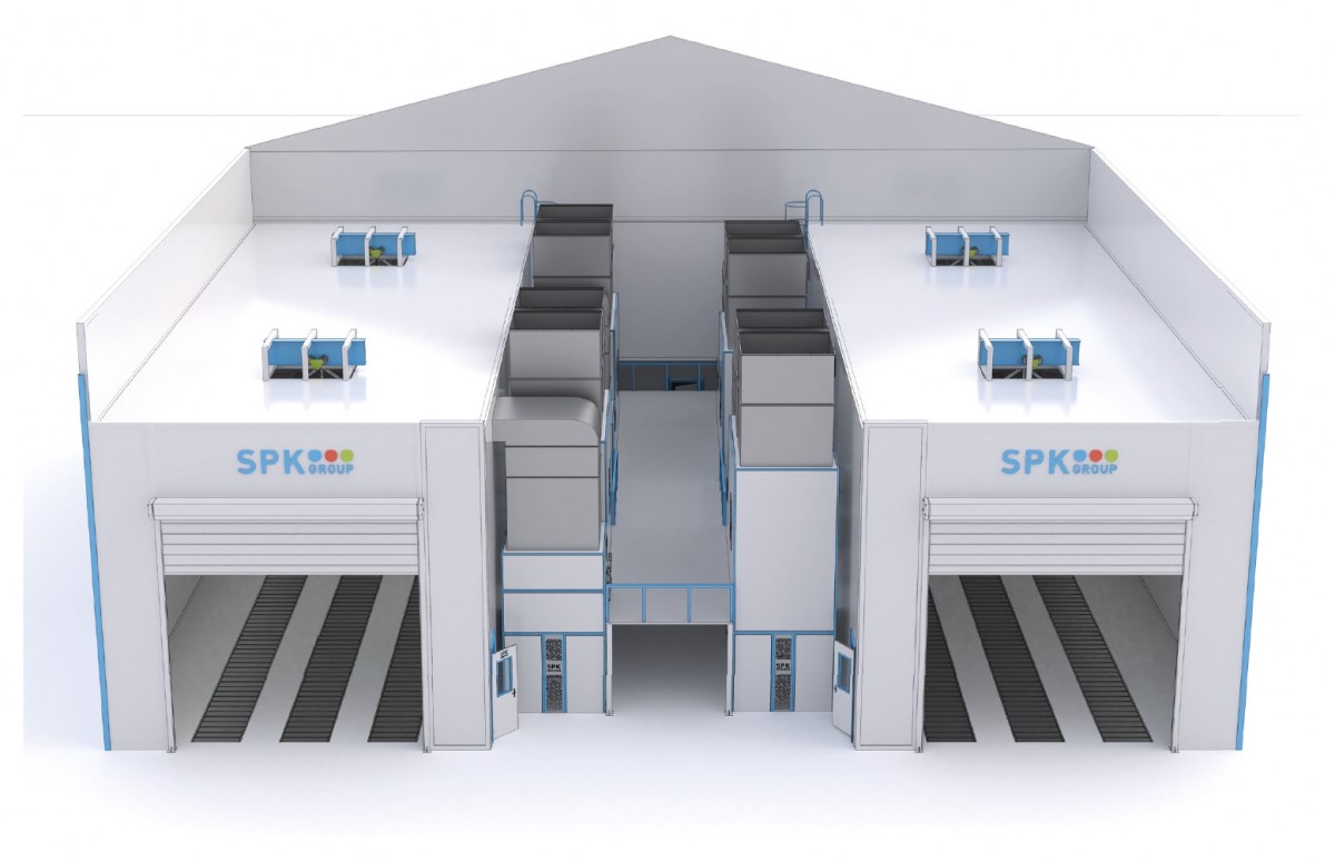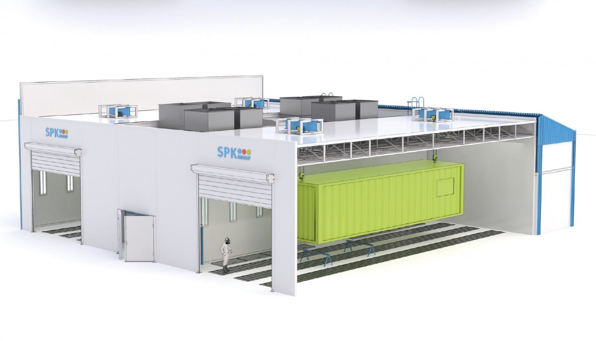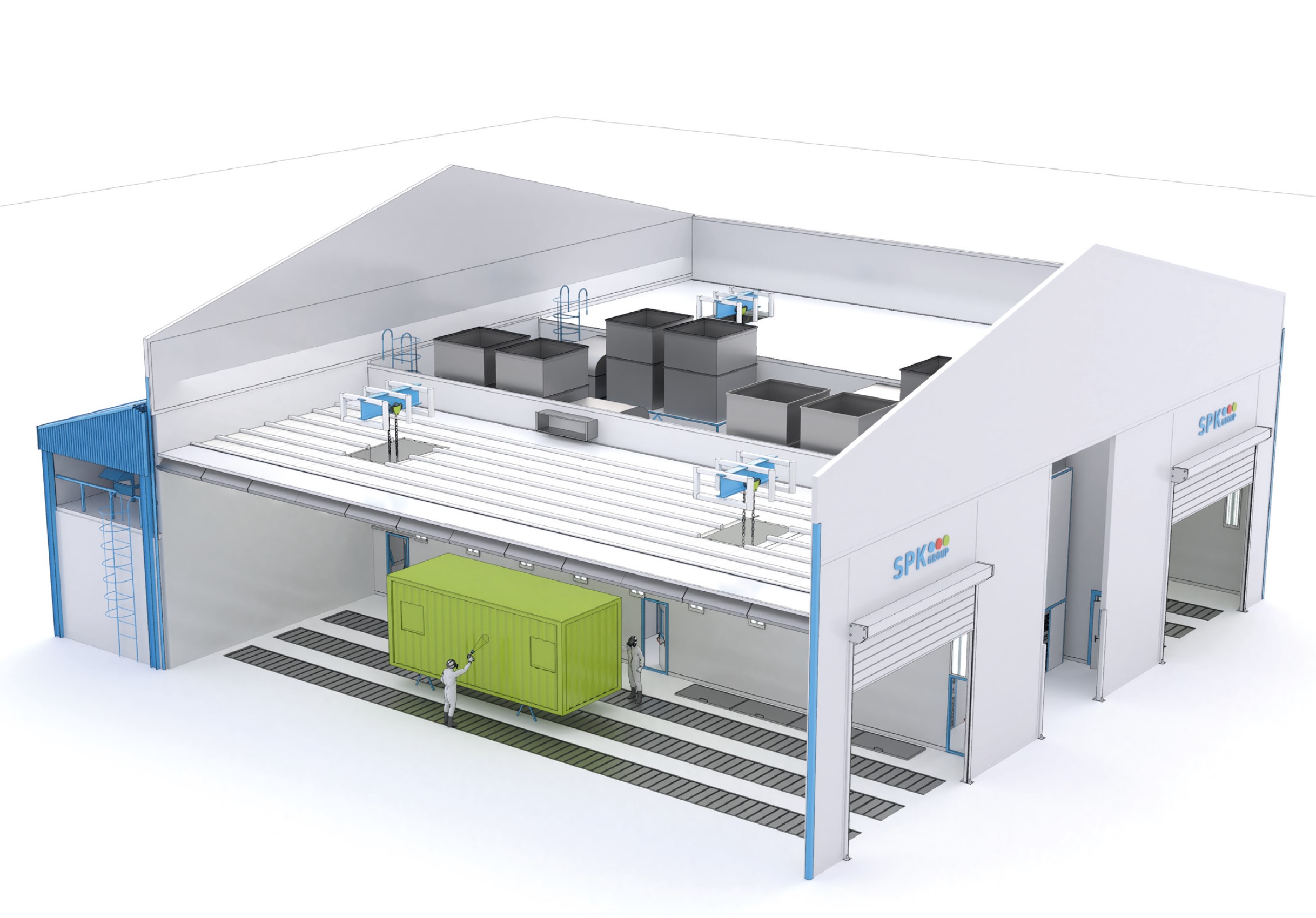 Двухсекционная окрасочно-сушильная камера уличного исполнения модели SPK-SCB-26.24.10 (далее — ОСК) предназначена для подготовки изделий к покраске, нанесения лакокрасочных покрытий и их последующей сушки при повышенной температуре. Внутри камеры обеспечивается равномерный поток очищенного и подогретого воздуха, движущегося сверху вниз, что способствует качественному нанесению покрытий. Камера оснащена сухой системой фильтрации воздуха от остатков краски, что обеспечивает оптимальные условия для нанесения лакокрасочных материалов и исключает необходимость в дополнительных очистных сооружениях.
