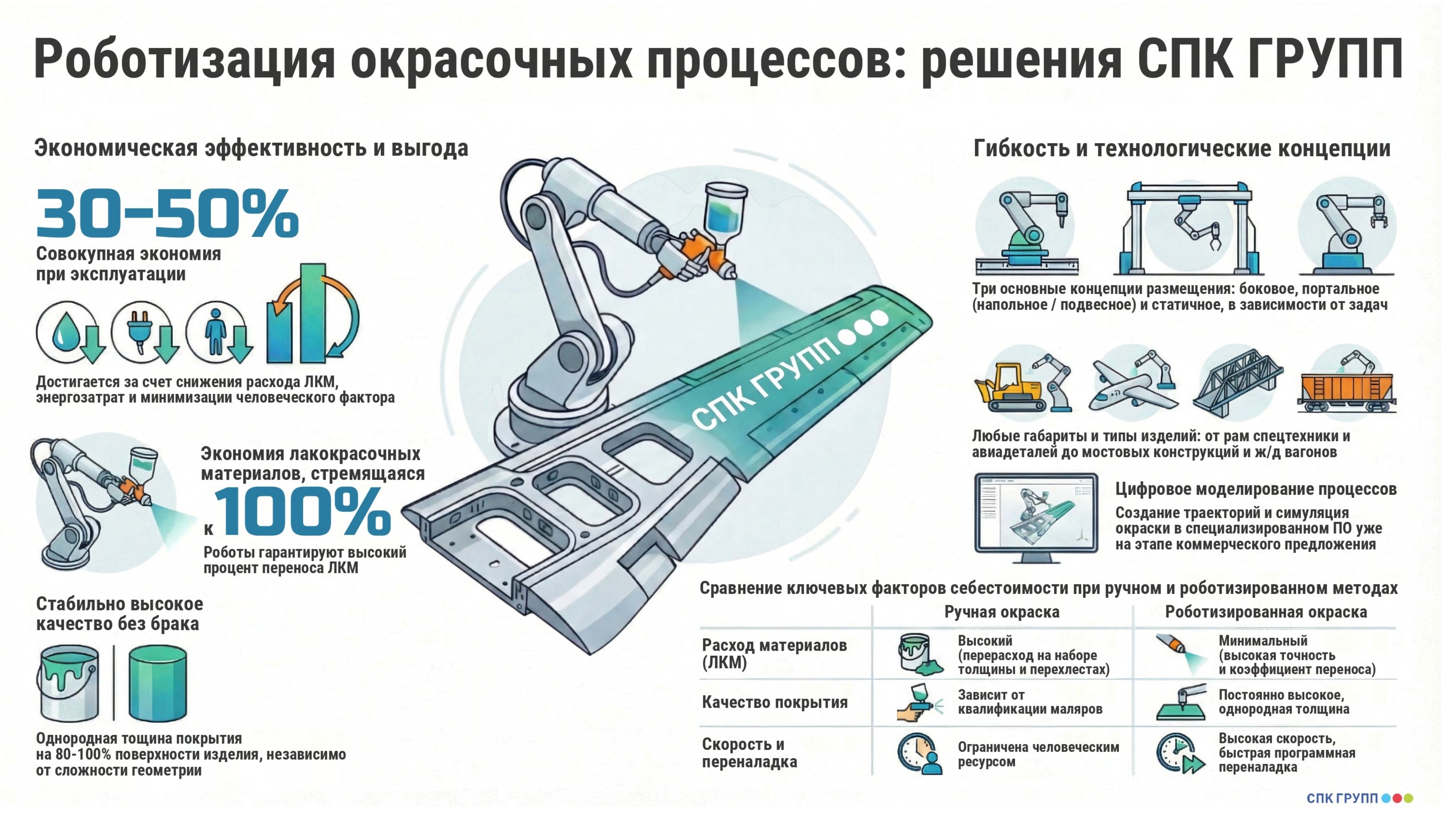 SPK GROUP осуществляет комплексное оснащение участка подготовки поверхности и окраски средствами автоматизации и роботизации. Чтобы кратко ознакомиться с составом роботизированного окрасочного комплекса, а также узнать о всех преимуществах роботизированной окраски на примере реализованных проектов мы предлагаем вам изучить каталог роботизированных комплексов нанесения покрытий SPK GROUP, который доступен по ссылке.