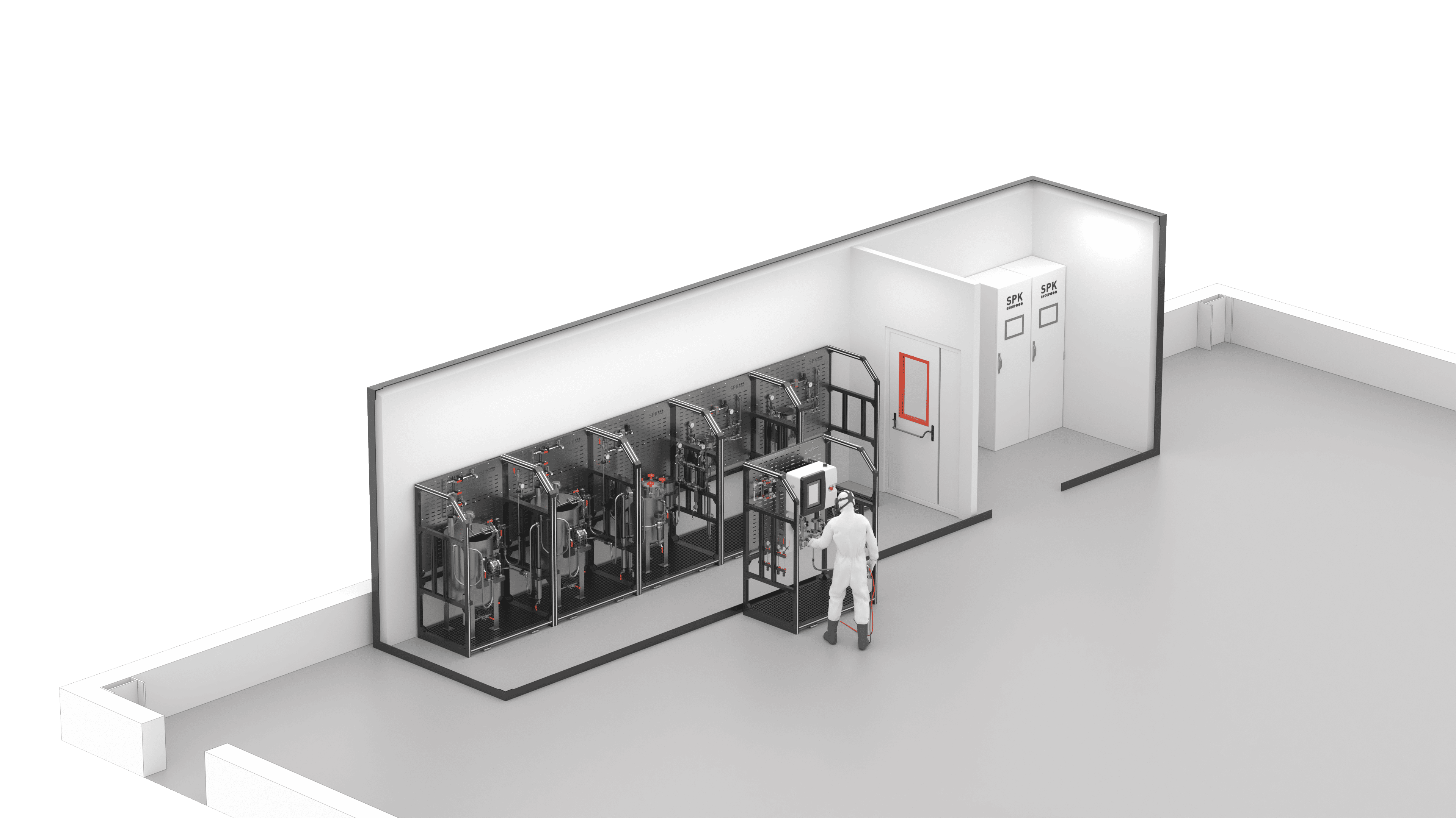 Компоненты и описание Система для подготовки и подачи ЛКМ включает оборудование, предназначенное для работы с двухкомпонентными и однокомпонентными ЛКМ. Установка монтируется в отделении для приготовления красок SPK-PKS и изготавливается в виде модульных конструкций, предварительно собранных на производственной площадке компании SPK GROUP.