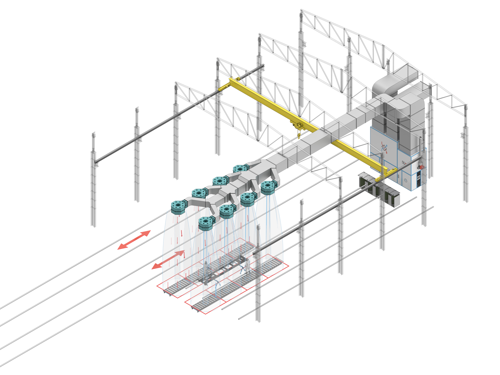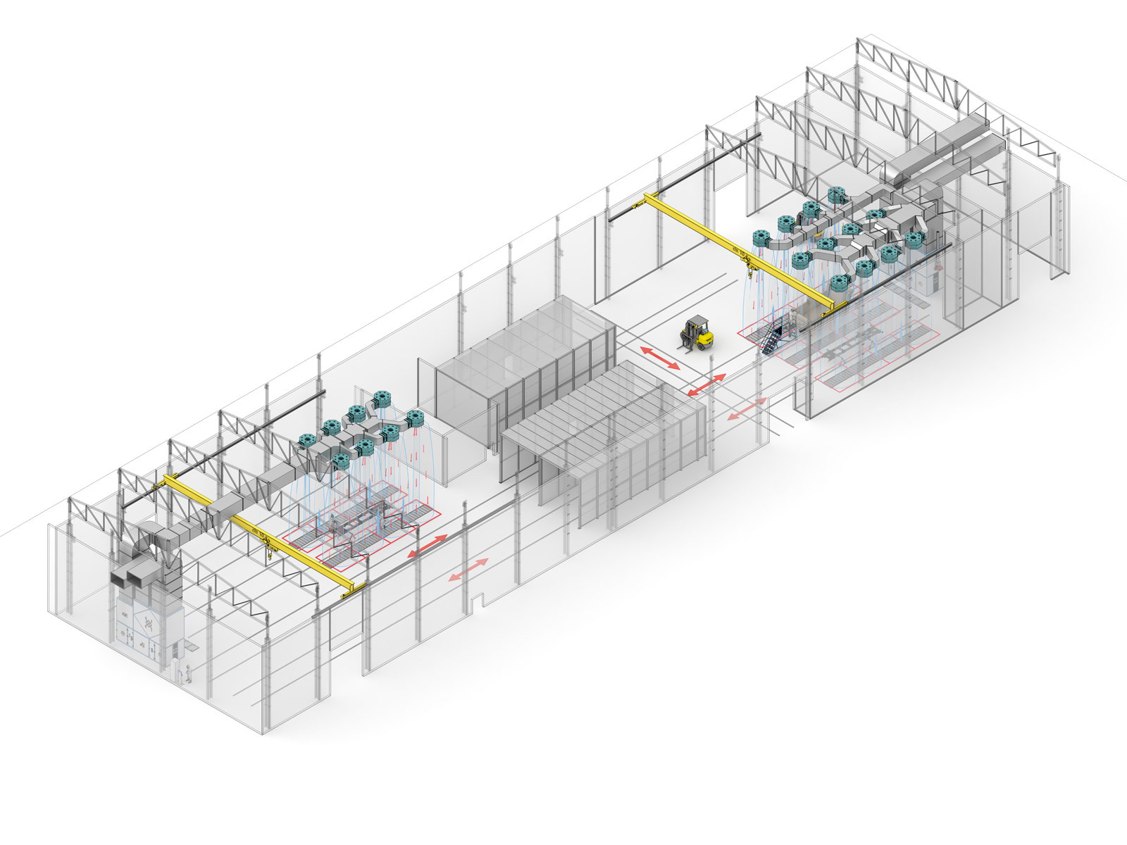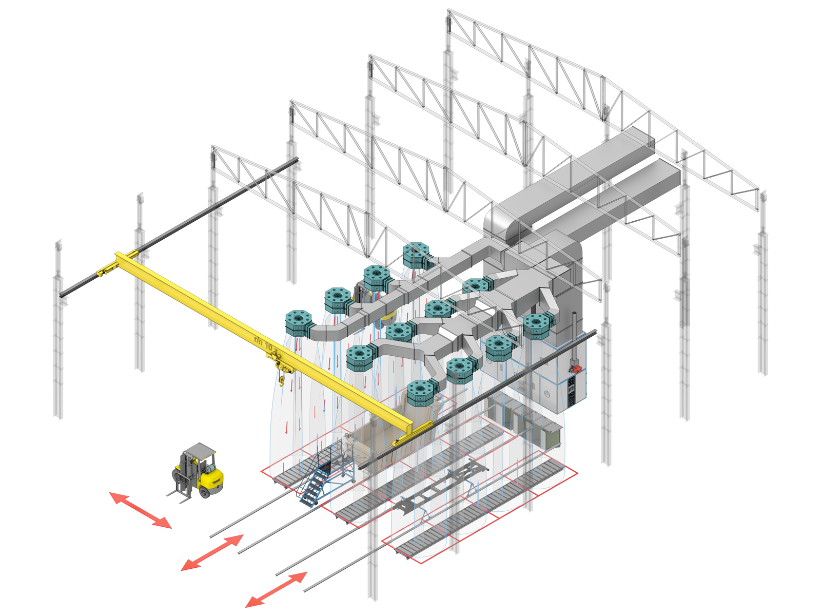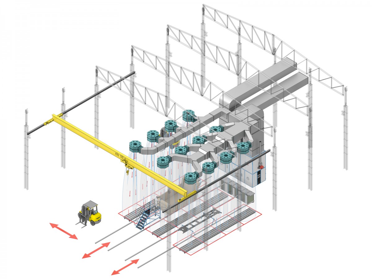 При проектировании поддерживающих конструкций воздуховодов и сопел важно учитывать, что масса одного сопла составляет примерно 280 кг, нагрузка от воздуховодов — 65 кг/м². Вес металлоконструкций рассчитывается отдельно. Расположение сопел, воздуховодов и оборудования распланировано схематично и в масштабе на визуализациях проекта.