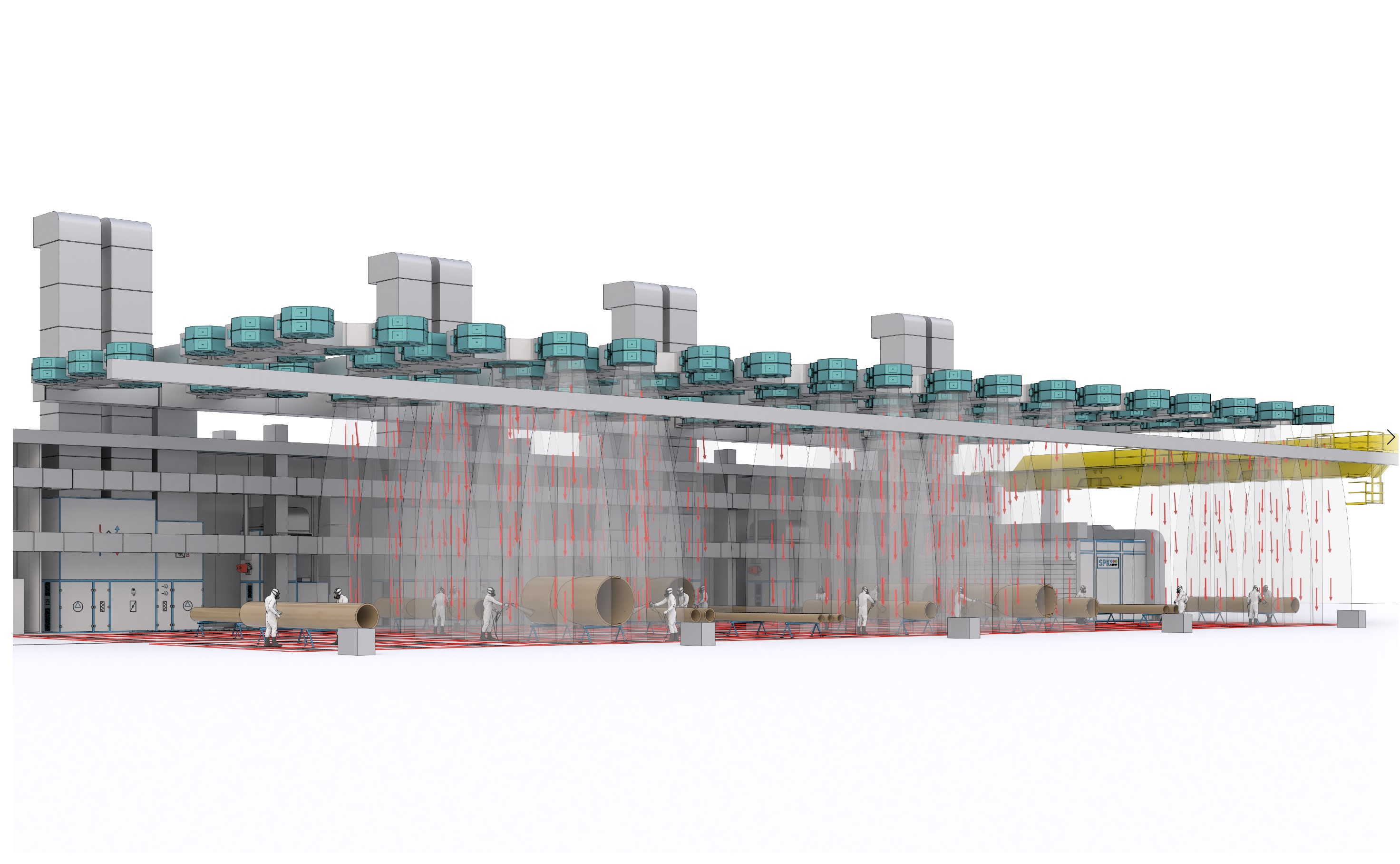 - Циркуляционный вентилятор SPK-VU-30 производительностью 30000 м³/час с взрывозащищённым двигателем и газовым воздухонагревателем мощностью прибл. 270 кВт, фильтр класса G4;