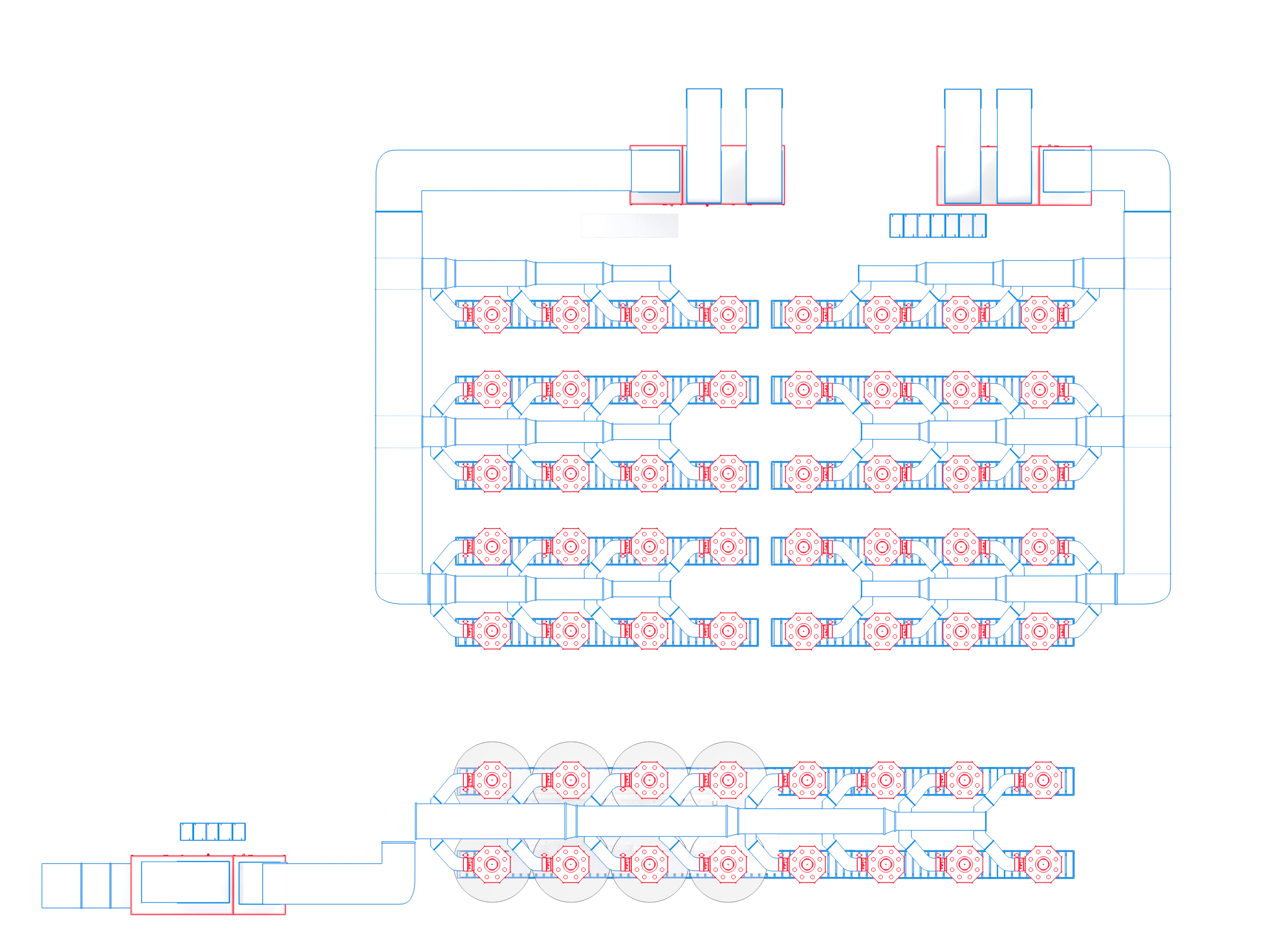 Все сопла могут работать индивидуально и независимо. Для удобства оператора организовывается программное деление на участки и секции, с дальнейшим легким выбором нужного участка в работу. Одновременно в работе может находиться три зоны: 12х6 или 3х24 метров.
