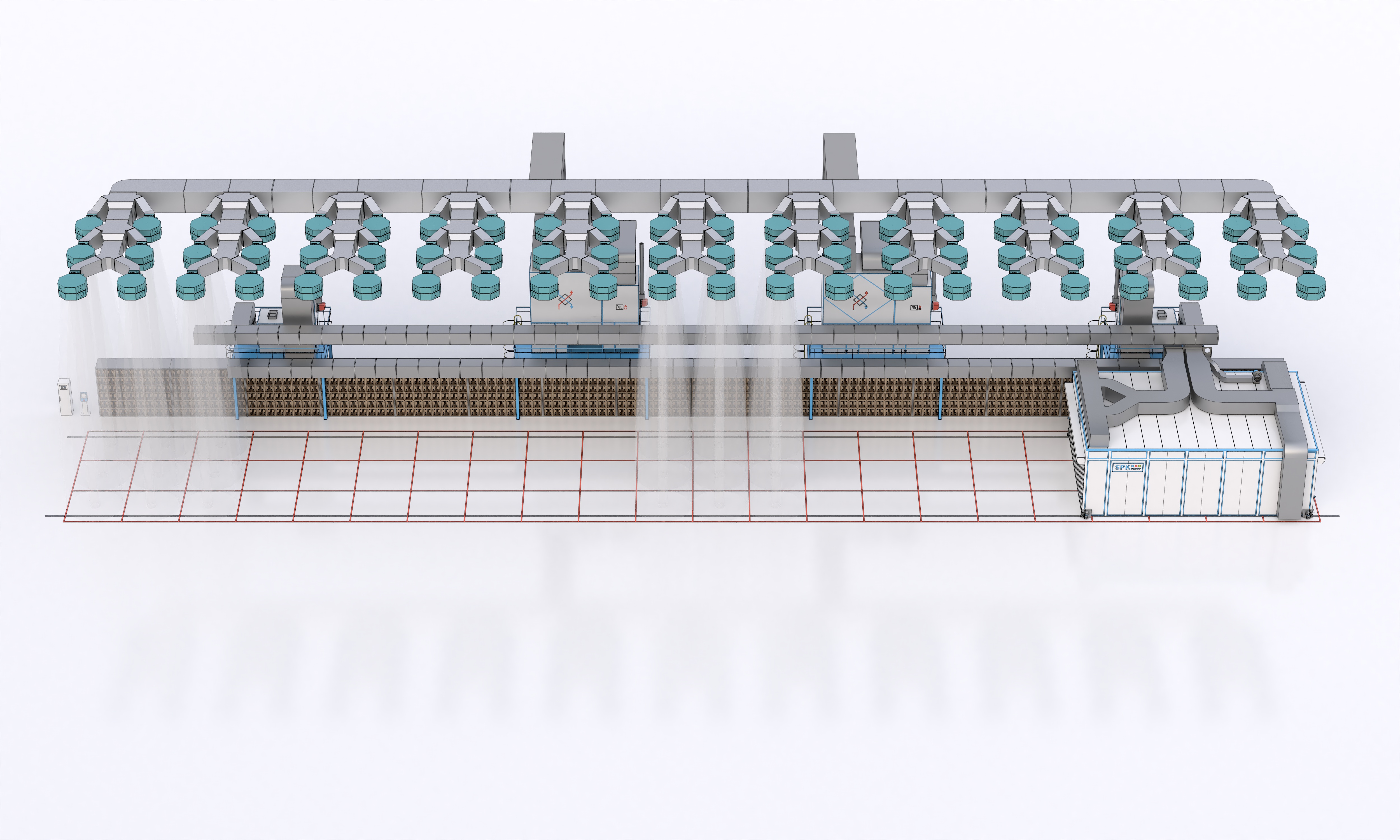 Циркуляция воздуха осуществляется с помощью сушильного вентиляционного агрегата SPKVU-35, создающий воздушный поток нагретого воздуха 35 000 м3/час. Нагрев осуществляется c помощью электрического теплообменника.