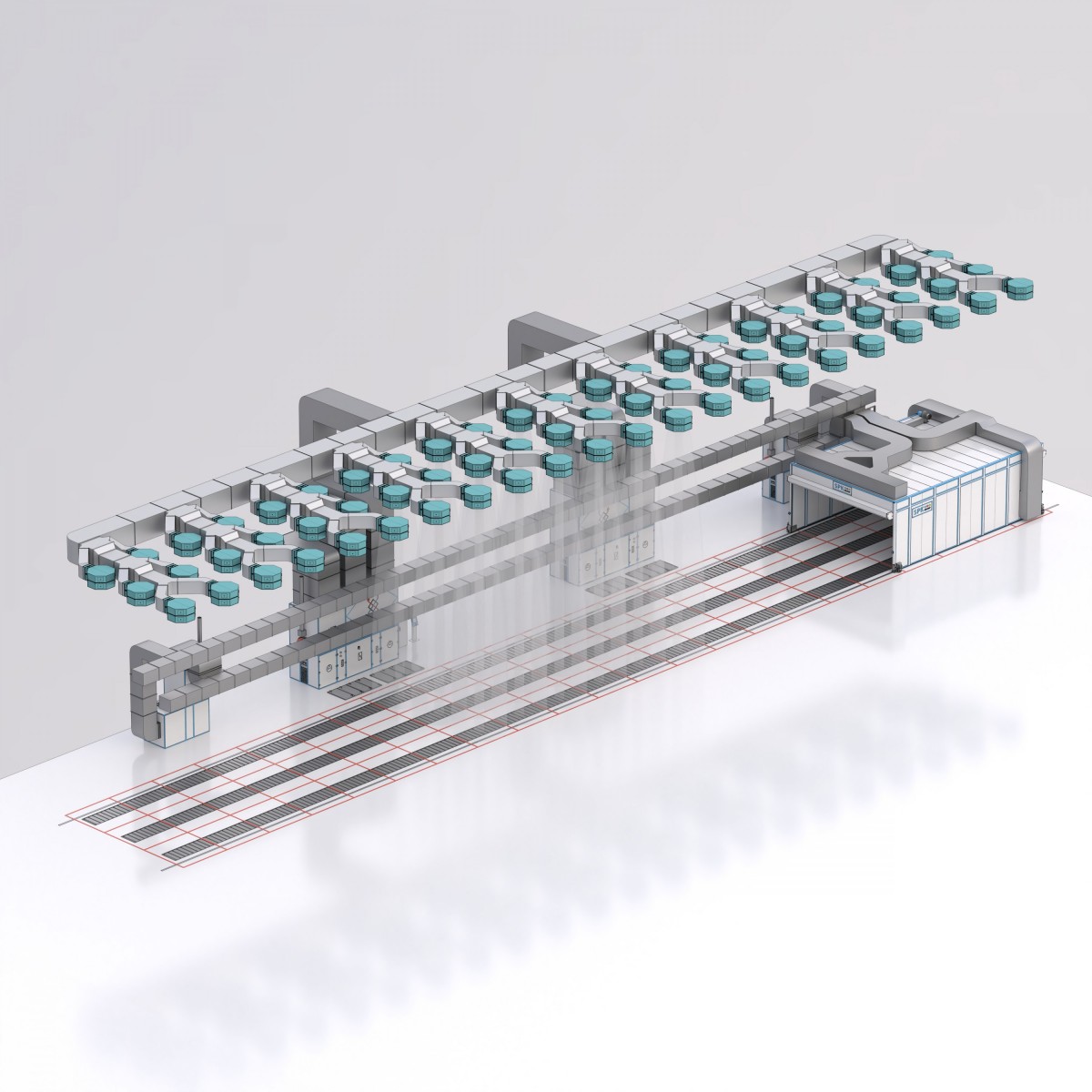 Подвод циркуляционного приточного воздуха в камеру осуществляется с помощью воздухораспределительной магистрали. В стационарных точках подключения воздуховодов мобильная камера сушки останавливается с помощью системы точного позиционирования. Герметичность соединения осуществляется с помощью раздвижной гибкой вставки. После соединения камеры с воздуховодом осуществляется открытие пневматического отсечного клапана и горячий циркуляционный воздух начинает поступать в камеру.